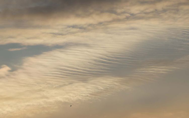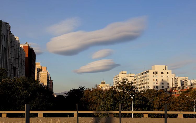 早上七时四十五分,天空出现漂亮的荚状云。据气象北京介绍,荚状云,又称飞碟云,是指一种状如飞碟云形,以透镜形状出现在高空,通常形成于顺风的右侧。