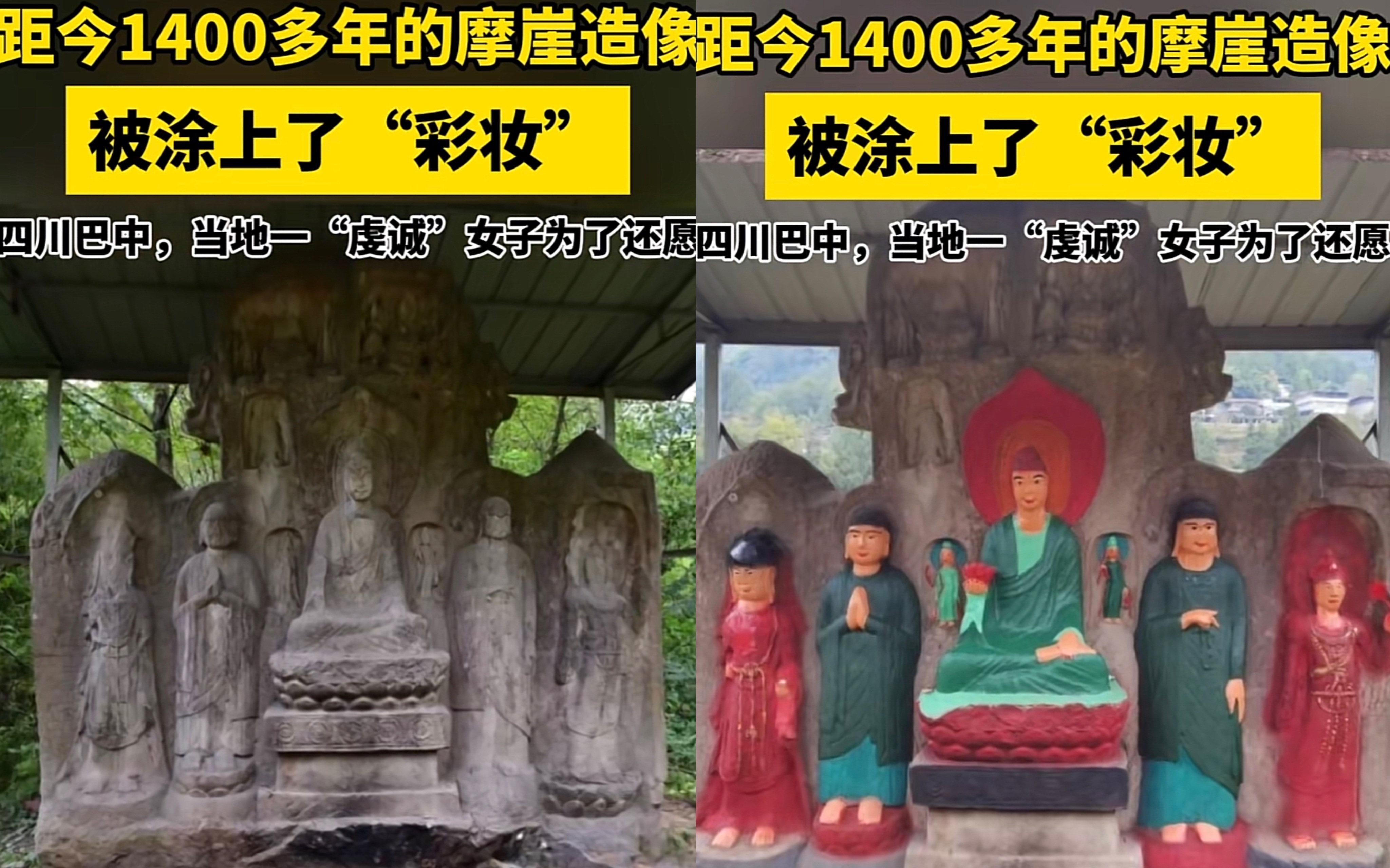 ▲摩崖造像被村民涂抹的前后对比。图/社交媒体视频截图
