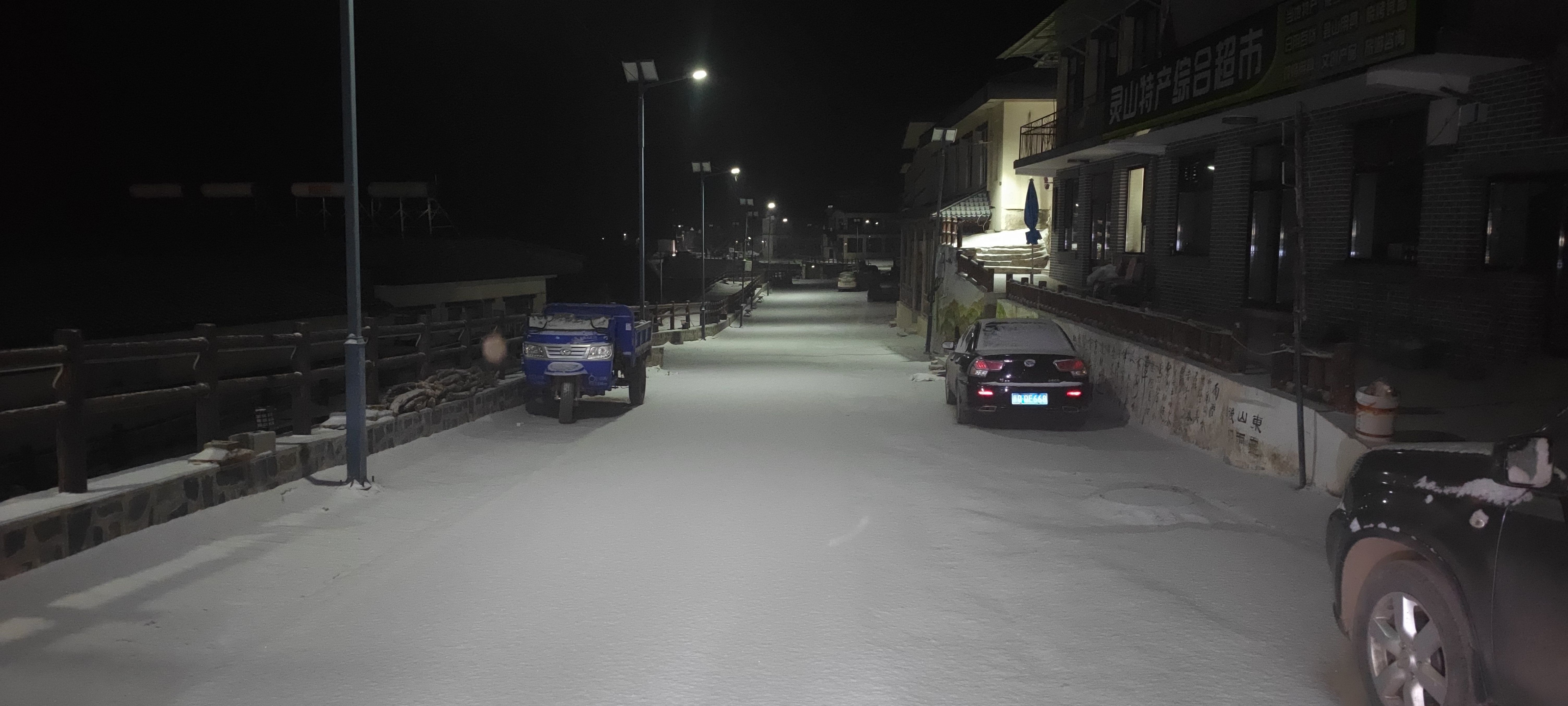 11月15日晚,灵山脚下的江水河村,雪覆盖了路面。受访者供图