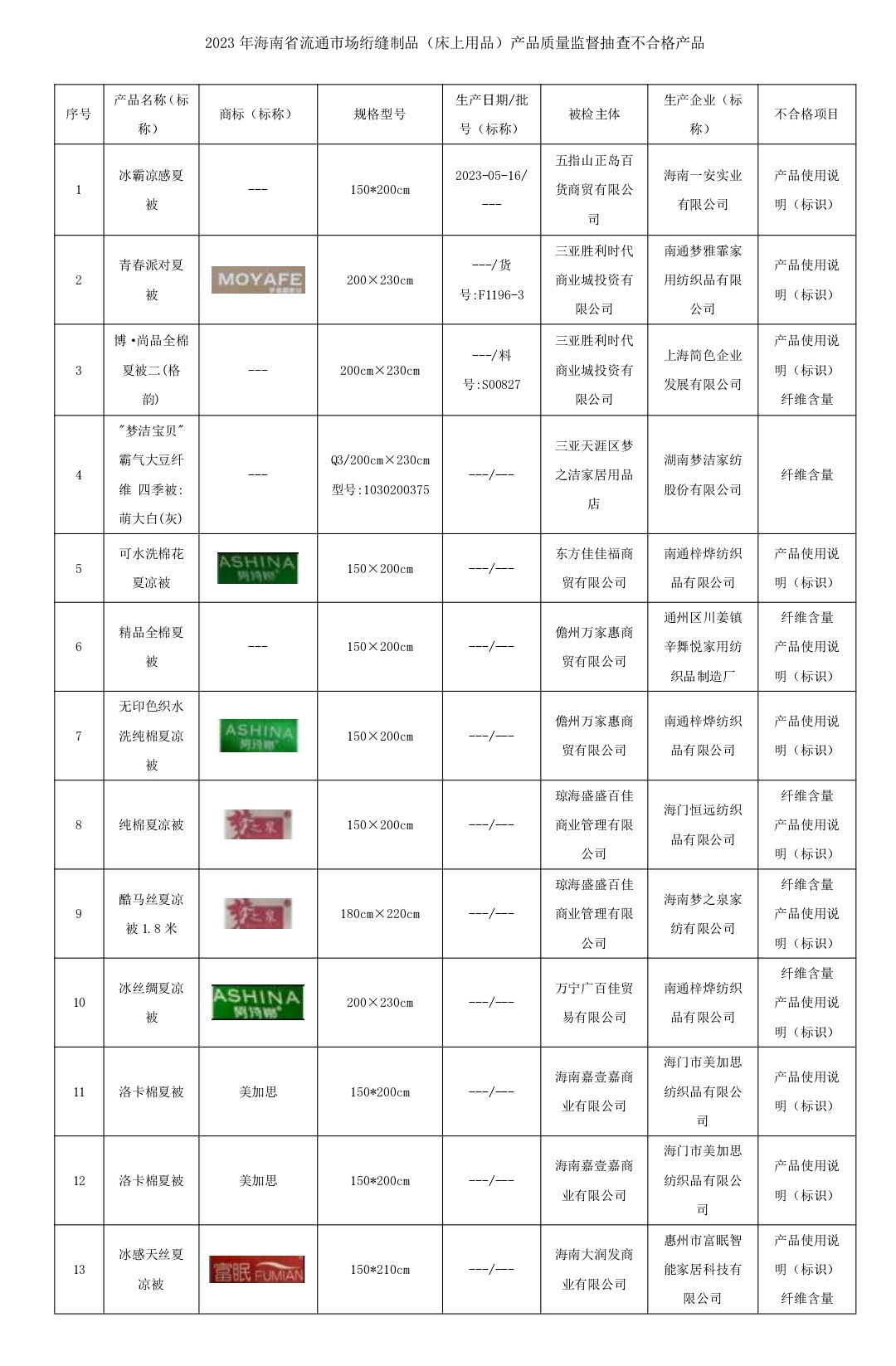 本次抽查不合格样品的生产企业(标称)涉及海南一安实业有限公司、南通梦雅霏家用纺织品有限公司、上海简色企业发展有限公司、湖南梦洁家纺股份有限公司、南通梓烨纺织品有限公司、惠州市富眠智能家居科技有限公司等。