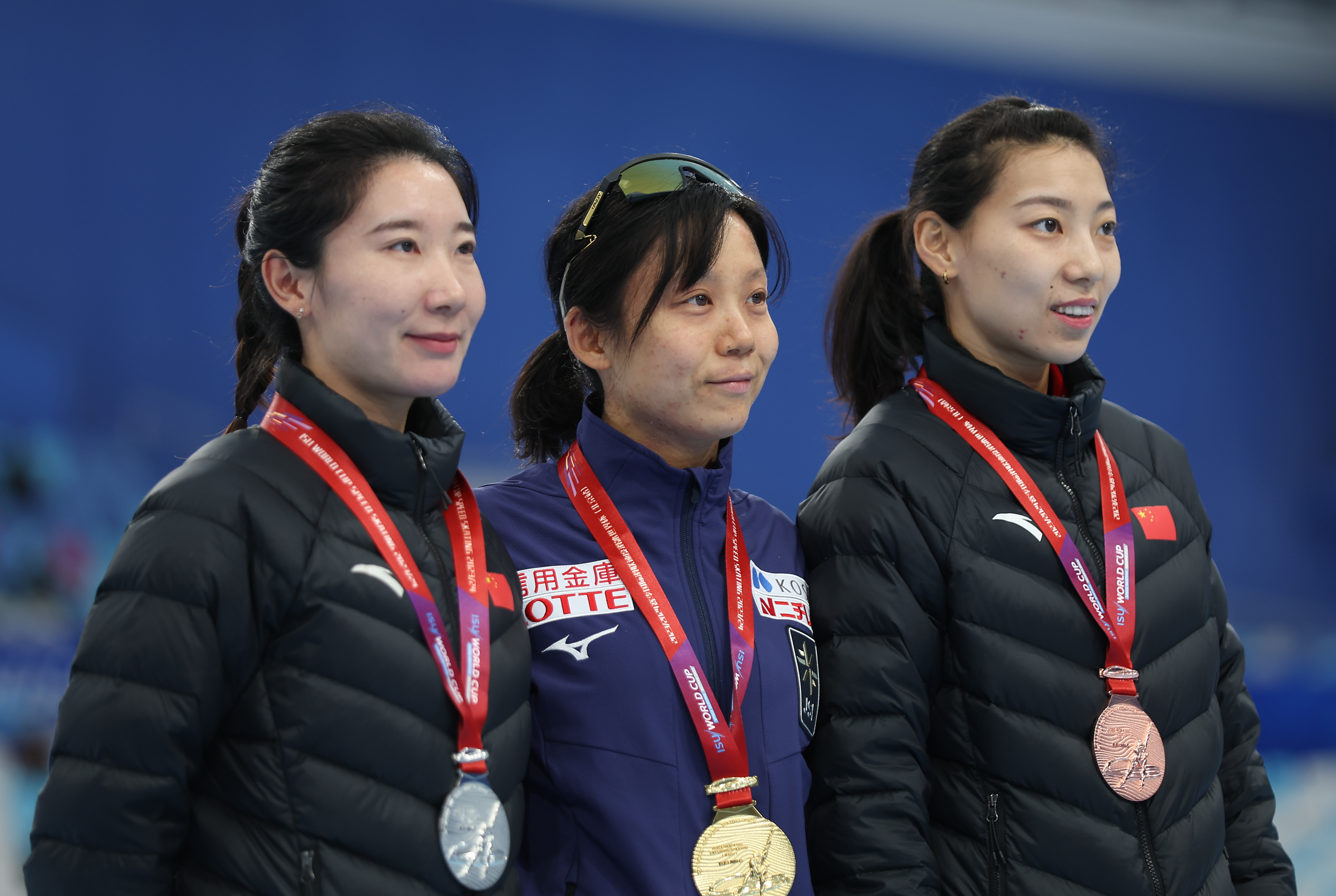 冠军日本选手高木美帆(中)、亚军中国选手韩梅(左)和季军中国选手李奇时在颁奖仪式上。 图/新华社