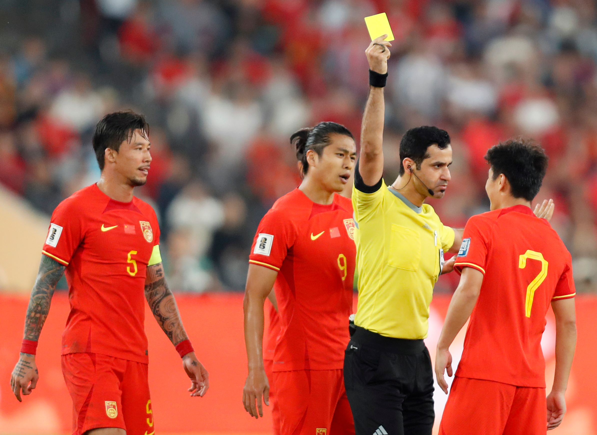 武磊(右)因不满判罚,被裁判出示了黄牌。 图/新华社