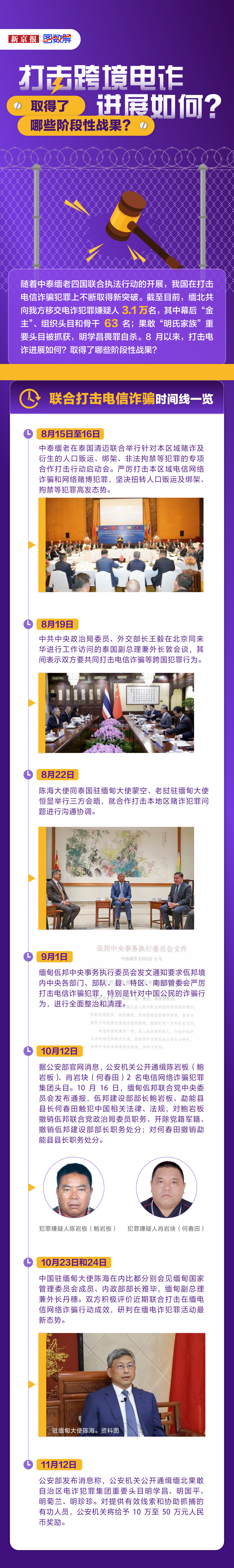 随着中泰缅老四国联合执法行动的开展,我国在打击电信诈骗犯罪上不断取得新突破。截至目前,缅北共向我方移交电诈犯罪嫌疑人3.1万名,其中幕后“金主”、组织头目和骨干63名;果敢“明氏家族”重要头目被抓获,明学昌畏罪自杀。8月以来,打击电诈进展如何?取得了哪些阶段性战果?
