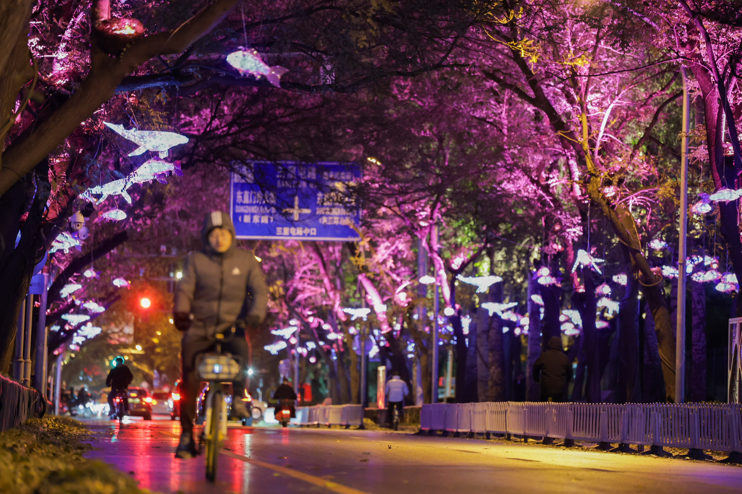 三里屯路宽阔的步行区域,多姿多彩的“繁星”悬在国槐树梢,灯光营造的火红色“凤凰”在繁花中展翅飞舞。