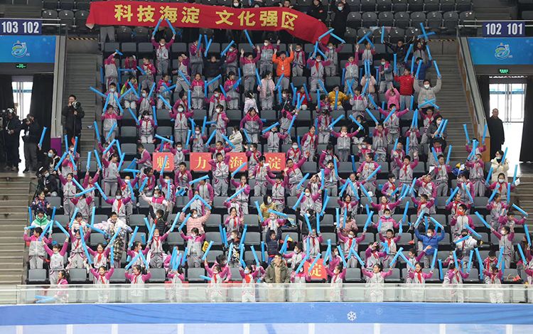 海淀助威团在为正在参加冰球表演的海淀队加油。