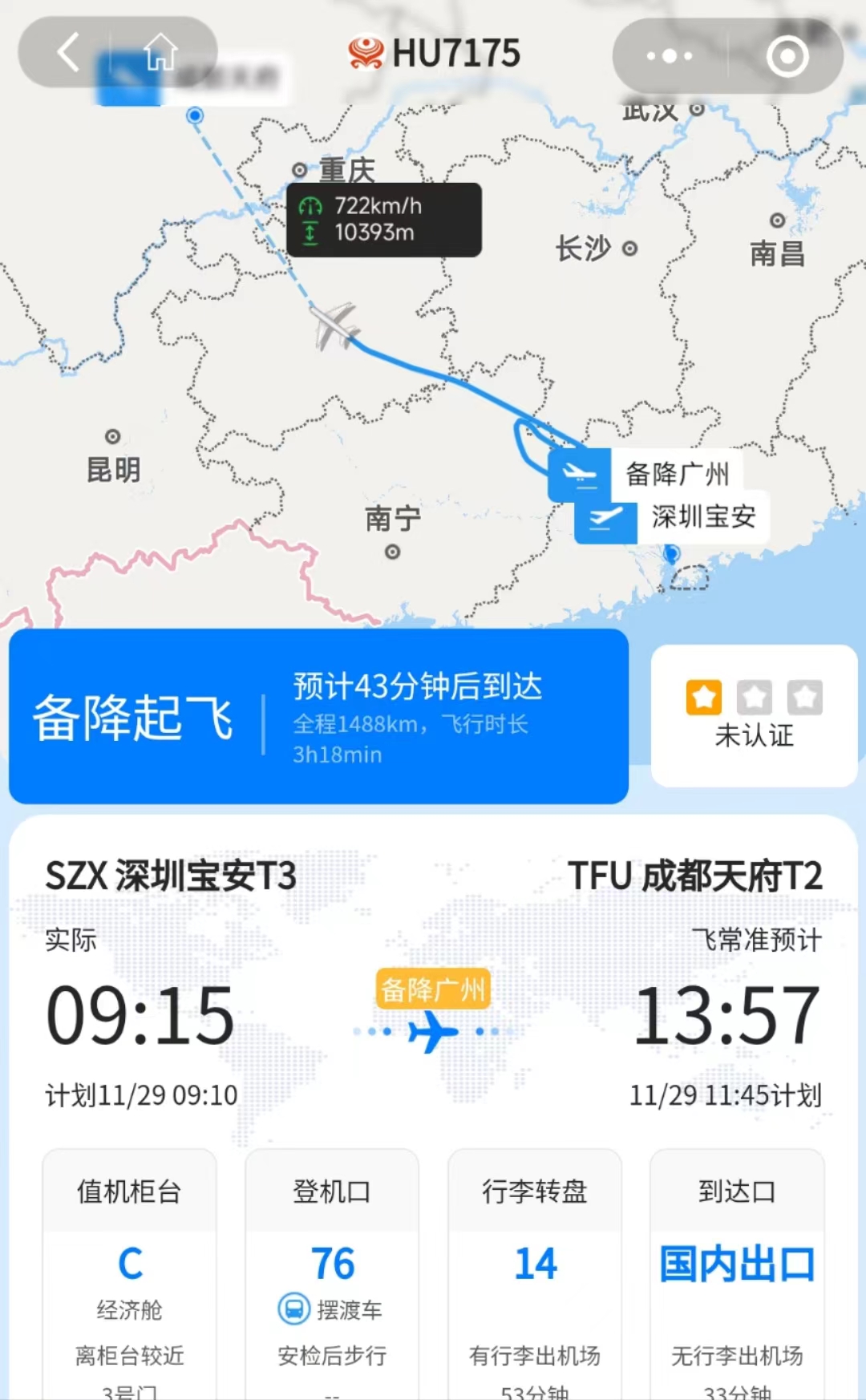 因乘客突发身体疾病,HU7175航班于10时39分备降广州白云机场,11时43分从广州起飞,继续飞往目的地成都。