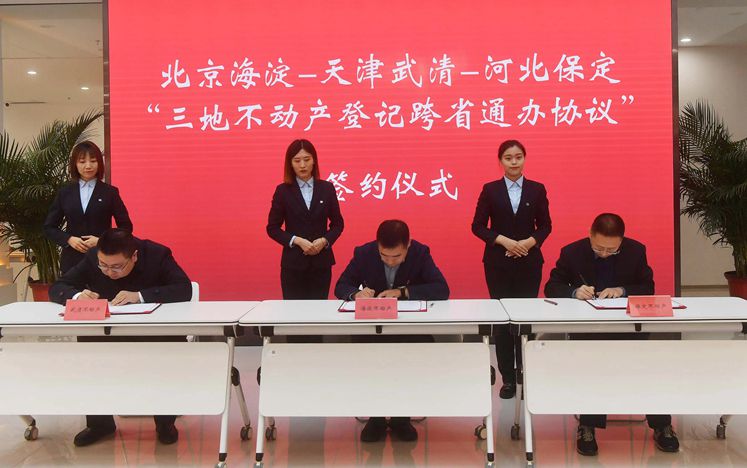 北京市海淀区不动产登记中心、天津市武清区自然资源调查与登记中心、河北省保定市不动产登记中心共同签署《不动产登记“跨省通办”合作框架协议》,推出19项通办事项清单。新京报记者 浦峰 摄