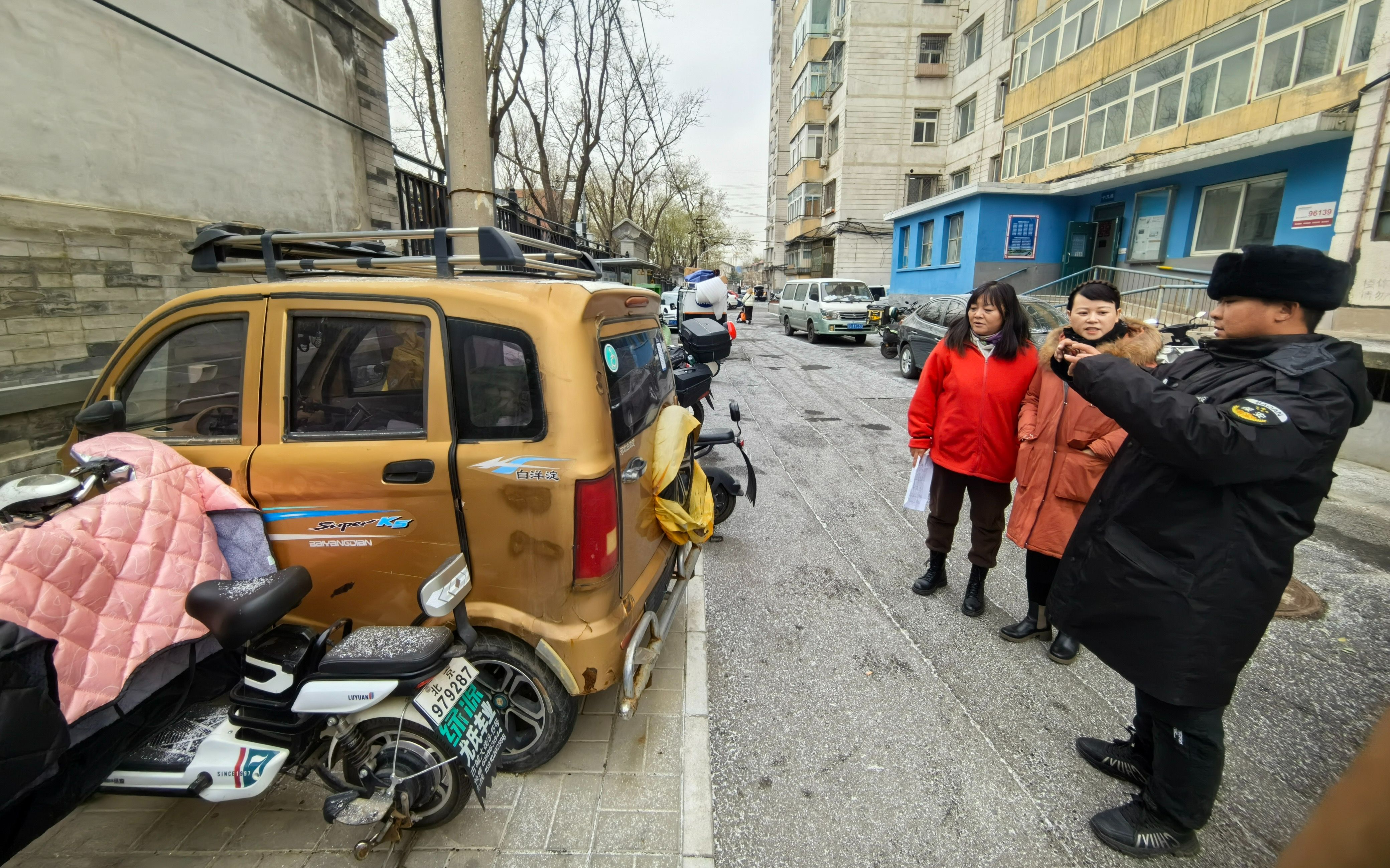 “您好,我是模东居委会的工作人员,违规电动三、四轮车明年起就不能上路了,也不能在公共场所停放。这是您家的三轮车吧?”街道包片杨朝霞副主任和社区工作人员带着回收平台的评估人员在辖区进行巡查,一起对违规电动三轮车车主进行询问、解释,现场由回收平台的评估人员对车辆进行估价。