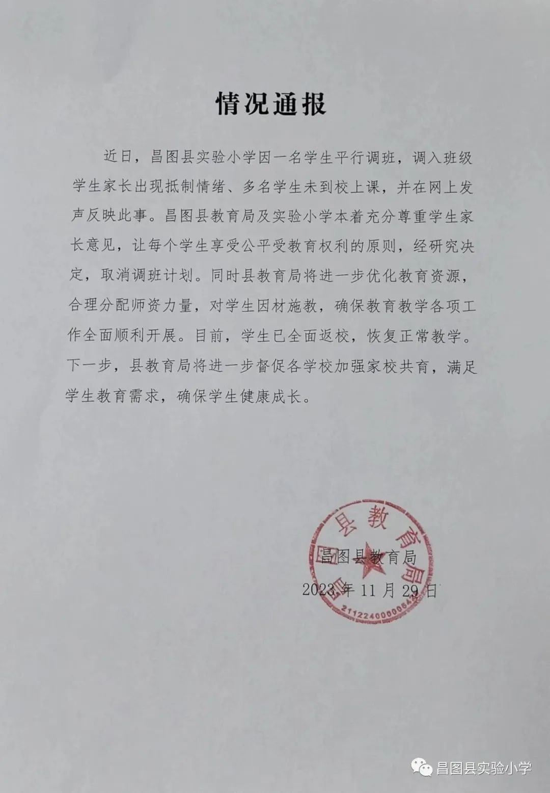 情况通报。图源:昌图县实验小学微信公众号