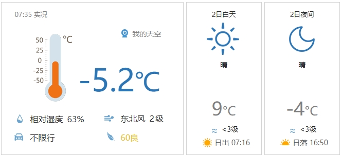 今天白天晴,北风三级左右转南风一二级,最高气温9℃;夜间晴间多云,南转北风一二级,最低气温零下5℃。