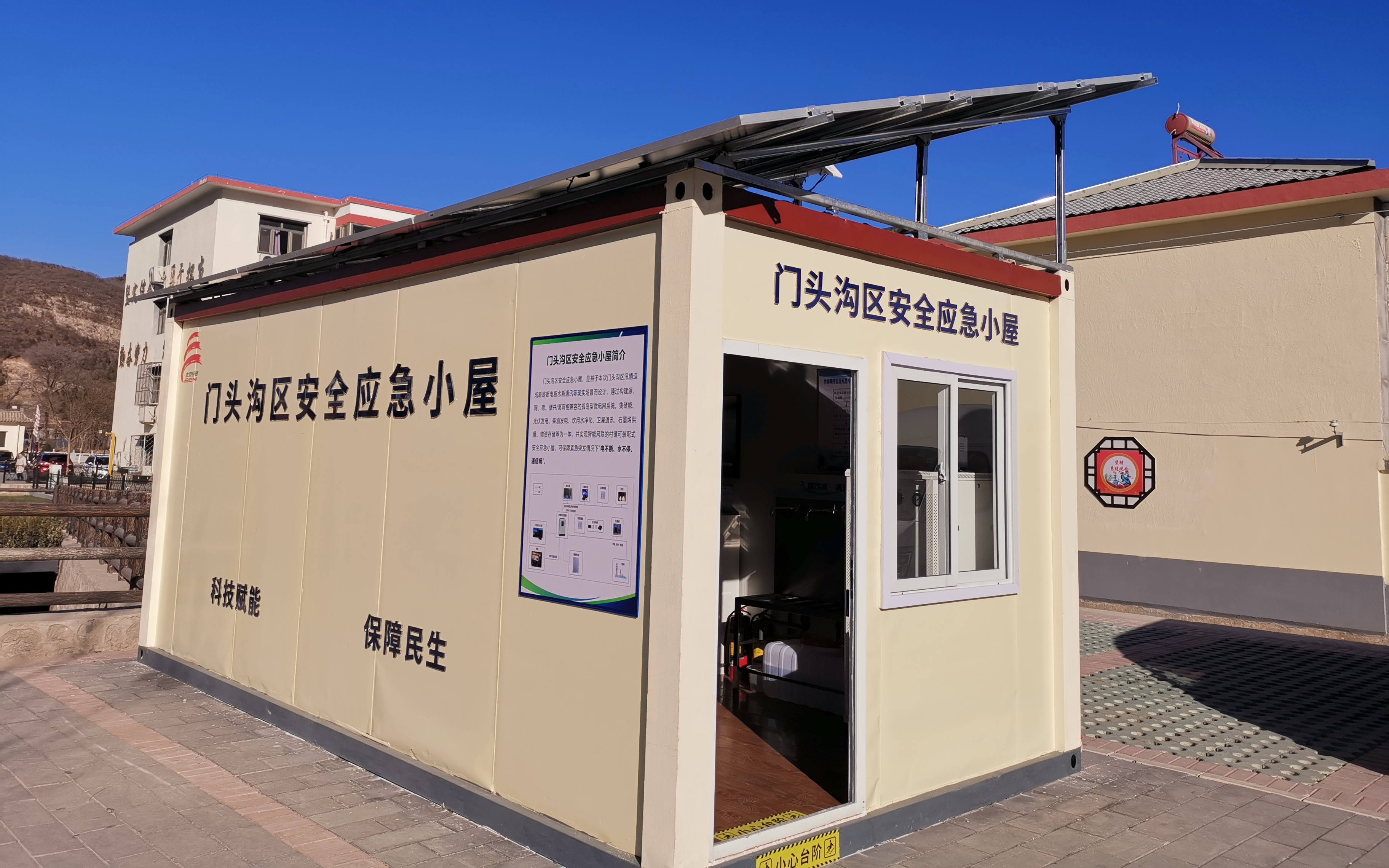 在门头沟区水峪嘴村18平方米的安全应急小屋,雨水通过净化可以变成饮用水、拨打卫星电话无需提前“对星”、屋顶的光伏发电设备可向小屋中的用电设备供电……