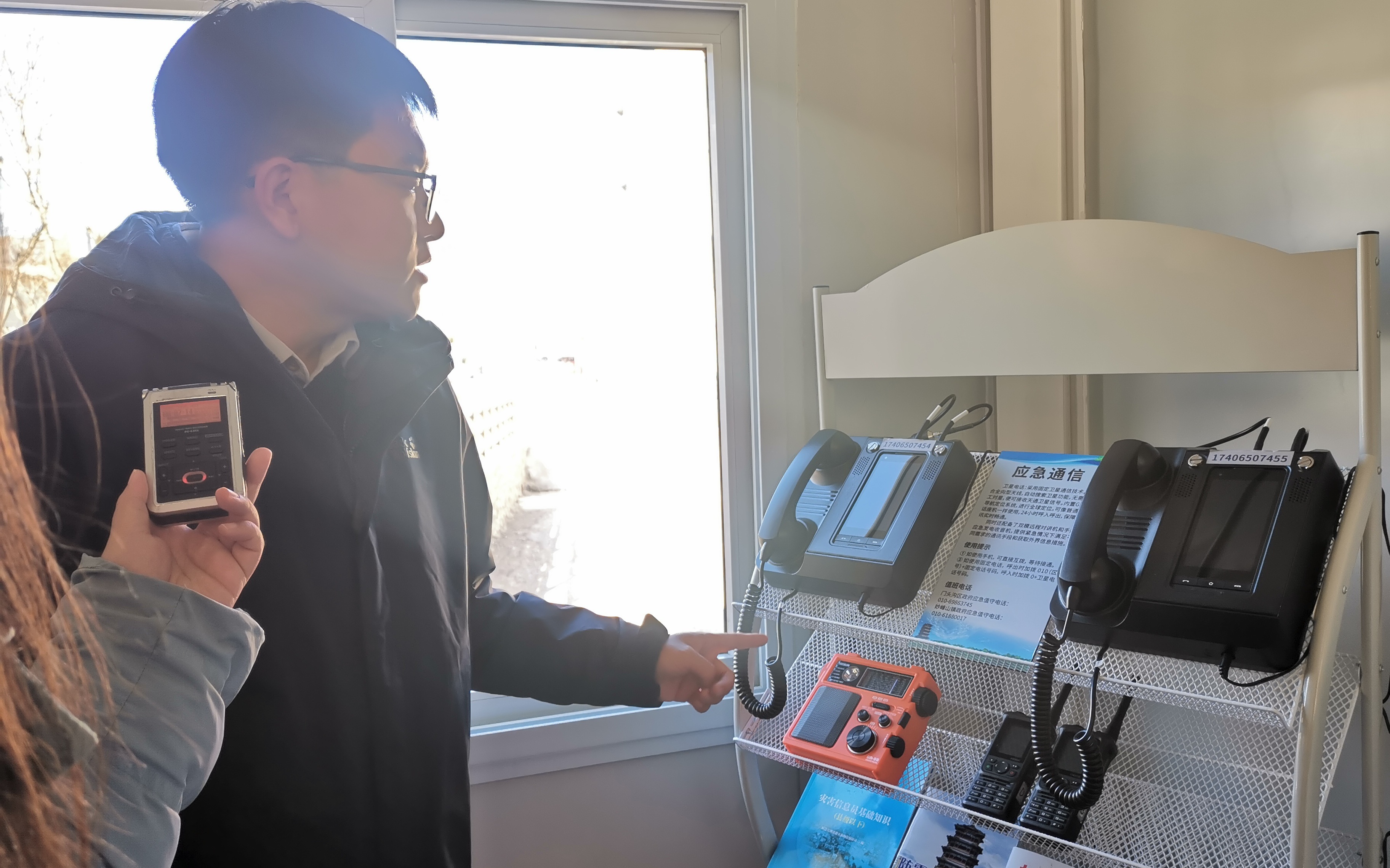 安全应急小屋的角落里设置了卫星电话、双模远程对讲机和手摇应急发电收音机。新京报记者 张璐 摄