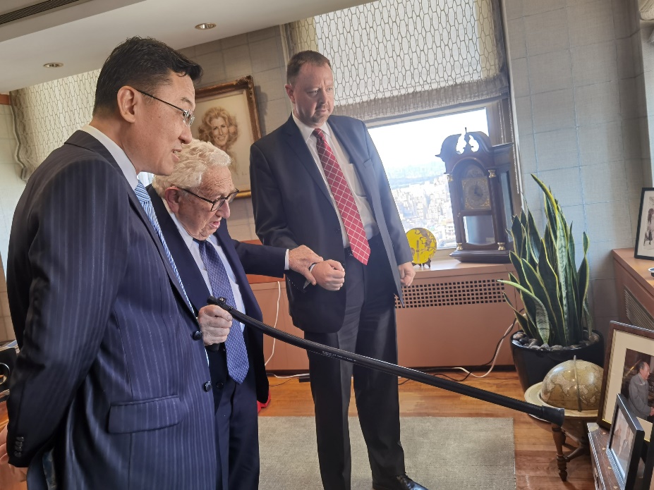 他百余次访华,今年7月百岁寿辰后再次踏上中国之旅。习近平主席专门在钓鱼台国宾馆5号楼设宴款待,这也是当年博士首次访华见到周恩来总理的地方。我至今清晰记得,博士自豪地带我参观他办公室里的“中国角”,讲述他与中国领导人每张合影背后的故事。“我可能会再去中国”,他眼中闪烁着期盼的神采。