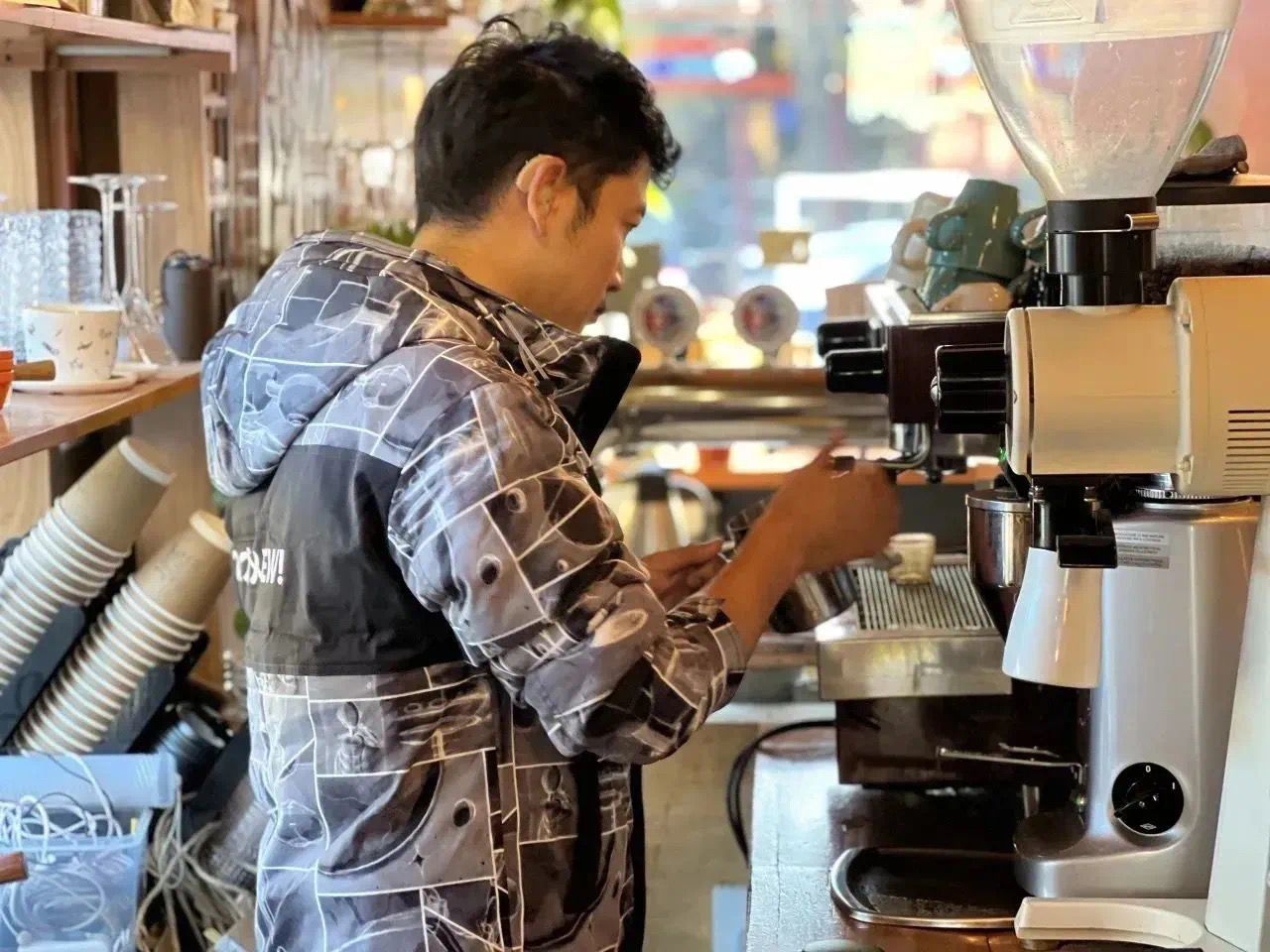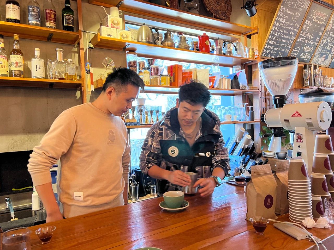 张辰成为了第一批在这里实习的咖啡师。称豆、研磨、冲泡……每天,一到店,张辰都会在孙文彪的指导下,先做一杯手冲咖啡。品尝后,他们会探讨味道,“通过这种方式,边学习、边进步。”为了更好地交流,孙文彪还自学了手语。