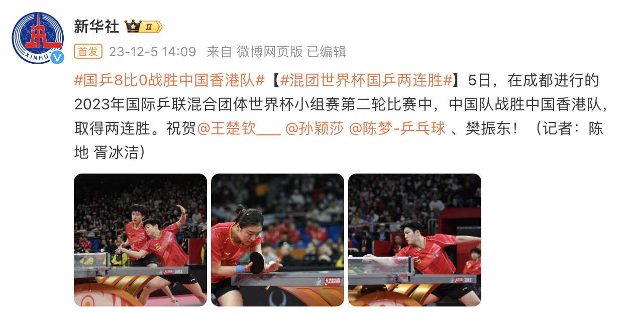 据@新华社 消息,5日,在成都进行的2023年国际乒联混合团体世界杯小组赛第二轮比赛中,中国队战胜中国香港队,取得两连胜。祝贺王楚钦、孙颖莎、陈梦、樊振东!(记者:陈地 胥冰洁)