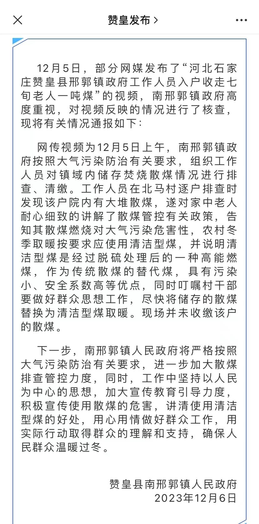 新京报讯 据赞皇发布官微消息,12月5日,部分网媒发布了“河北石家庄赞皇县邢郭镇政府工作人员入户收走七旬老人一吨煤”的视频,南邢郭镇政府高度重视,对视频反映的情况进行了核查,现将有关情况通报如下: