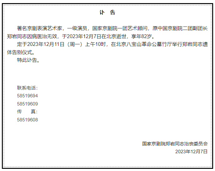 新京报讯 据中国国家京剧院官微消息,著名京剧表演艺术家,一级演员,国家京剧院一团艺术顾问,原中国京剧院二团副团长郑岩同志因病医治无效,于2023年12月7日在北京逝世,享年82岁。