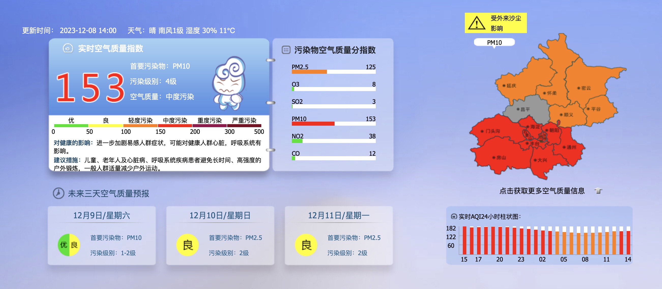 新京报讯 据北京市生态环境监测中心官网消息,截至12月8日14时,北京市空气质量指数为153,污染级别为4级,已达中度污染标准。目前空气中的首要污染物为PM10。