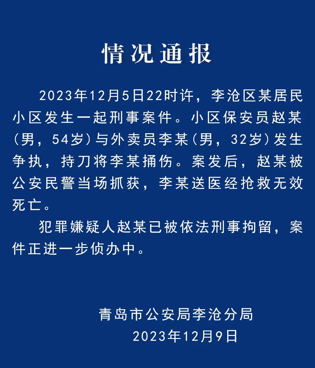 新京报讯 据李沧公安发布情况通报:2023年12月5日22时许,李沧区某居民小区发生一起刑事案件。小区保安员赵某(男, 54岁)与外卖员李某(男, 32岁)发生争执,持刀将李某捅伤。案发后,赵某被公安民警当场抓获,李某送医经抢救无效死亡。犯罪嫌疑人赵某已被依法刑事拘留,案件正进一步侦办中。