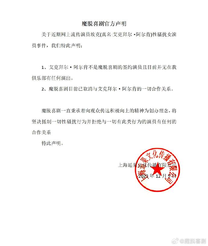 新京报讯 12月9日,魔脱喜剧官方微博就网传演员埃克性骚扰女演员事件发布声明。声明如下: