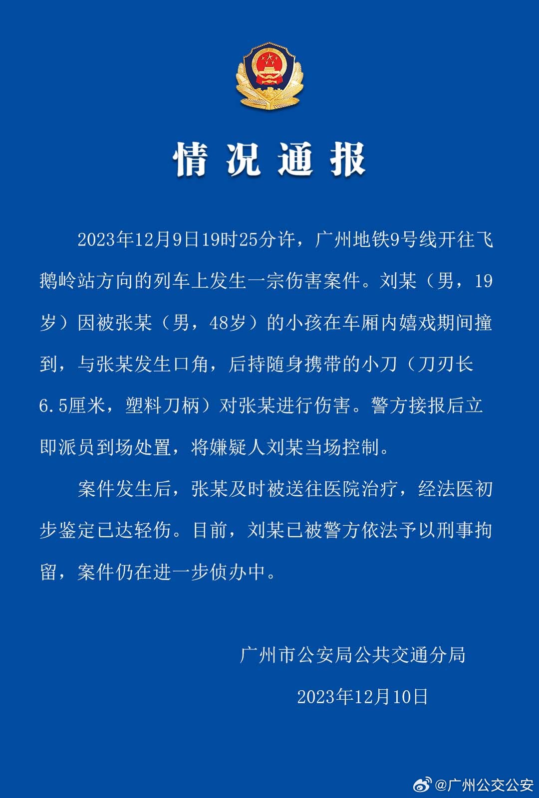 新京报讯 据@广州公交公安 消息,2023年12月9日19时25分许,广州地铁9号线开往飞鹅岭站方向的列车上发生一宗伤害案件。刘某(男,19岁)因被张某(男,48岁)的小孩在车厢内嬉戏期间撞到,与张某发生口角,后持随身携带的小刀(刀刃长6.5厘米,塑料刀柄)对张某进行伤害。警方接报后立即派员到场处置,将嫌疑人刘某当场控制。