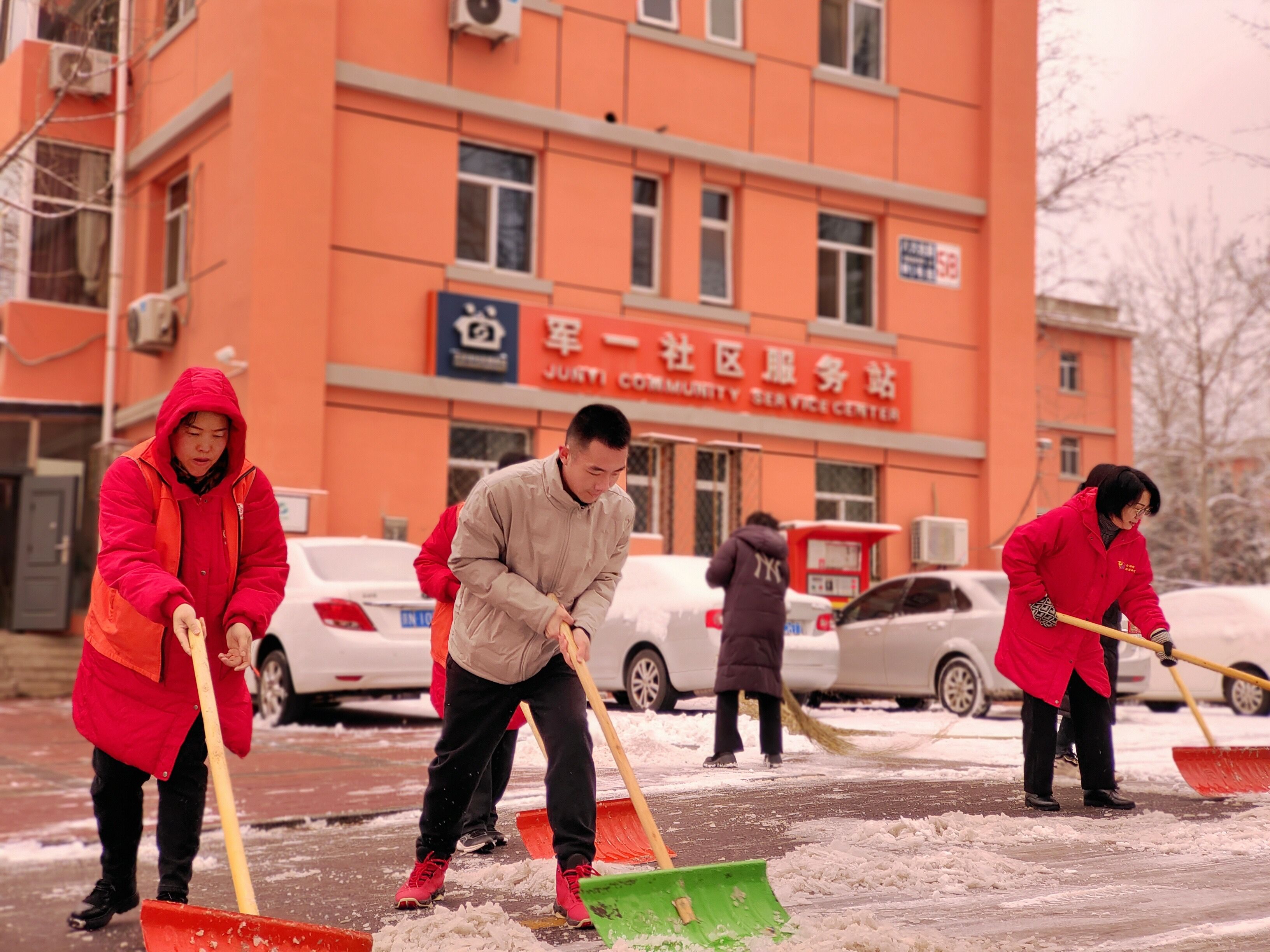 苹果园街道军一社区工作人员和居民对服务站前的积雪进行清扫。苹果园街道供图