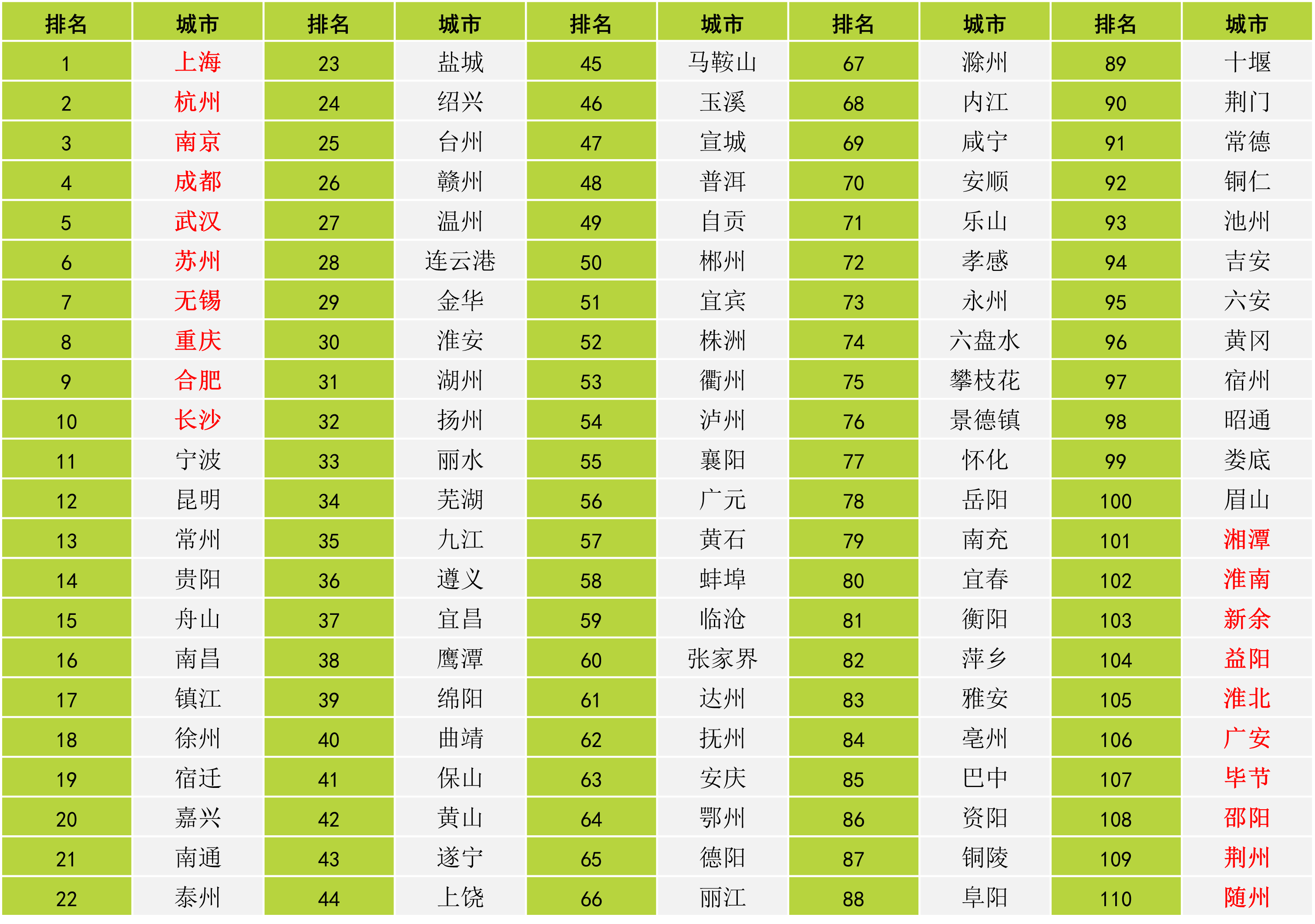 长江经济带城市协同发展能力指数(2023)表明,协同发展能力前十强城市依次为:上海、杭州、南京、成都、武汉、苏州、无锡、重庆、合肥、长沙。长沙因各方面表现发展均衡,自2020年后再次回归十强。湘潭、淮南、新余、益阳、淮北、广安、毕节、邵阳、荆州、随州则位列排行榜的后十名。
