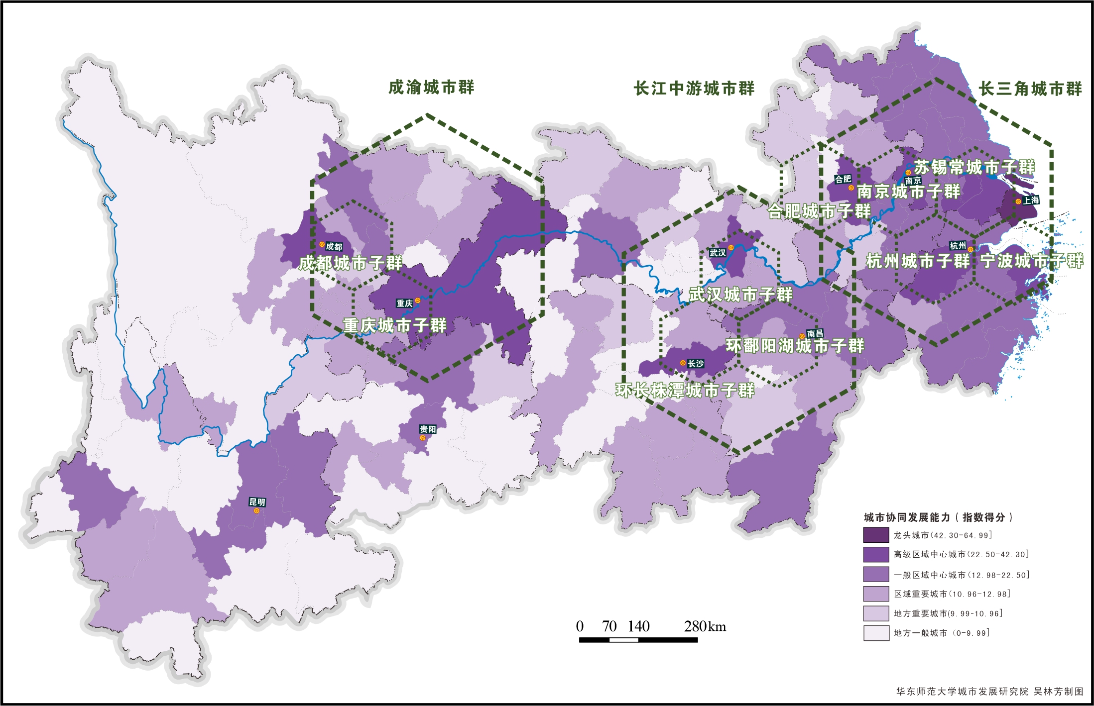 曾刚指出,长江经济带城市协同发展能力稳步上升,城市体系橄榄型结构不断优化。长江经济带城市协同发展能力指数(2023)表明,110座地级及以上城市呈现出6等级橄榄型结构特征:上海是龙头城市,协同发展能力在长江经济带排名首位;杭州、南京、成都、武汉、苏州、无锡、重庆、合肥、长沙、宁波10座城市是能力较强的高级区域中心城市;昆明、常州、贵阳、舟山、南昌等36座城市是在个别领域表现突出的一般区域中心城市;普洱、自贡、郴州、宜宾、株洲等36座城市是区域重要城市,往往地处较为重要的区位或拥有某方面独特的资源禀赋;亳州、巴中、资阳、铜陵、阜阳等15座城市是存在提升空间的地方重要城市;娄底、眉山、湘潭、淮南、新余等12座城市是存在短板或外向服务功能薄弱的地方一般城市。同时,2023年城市综合协同能力得分平均值为15.33分,比2022年增加了2.42分。