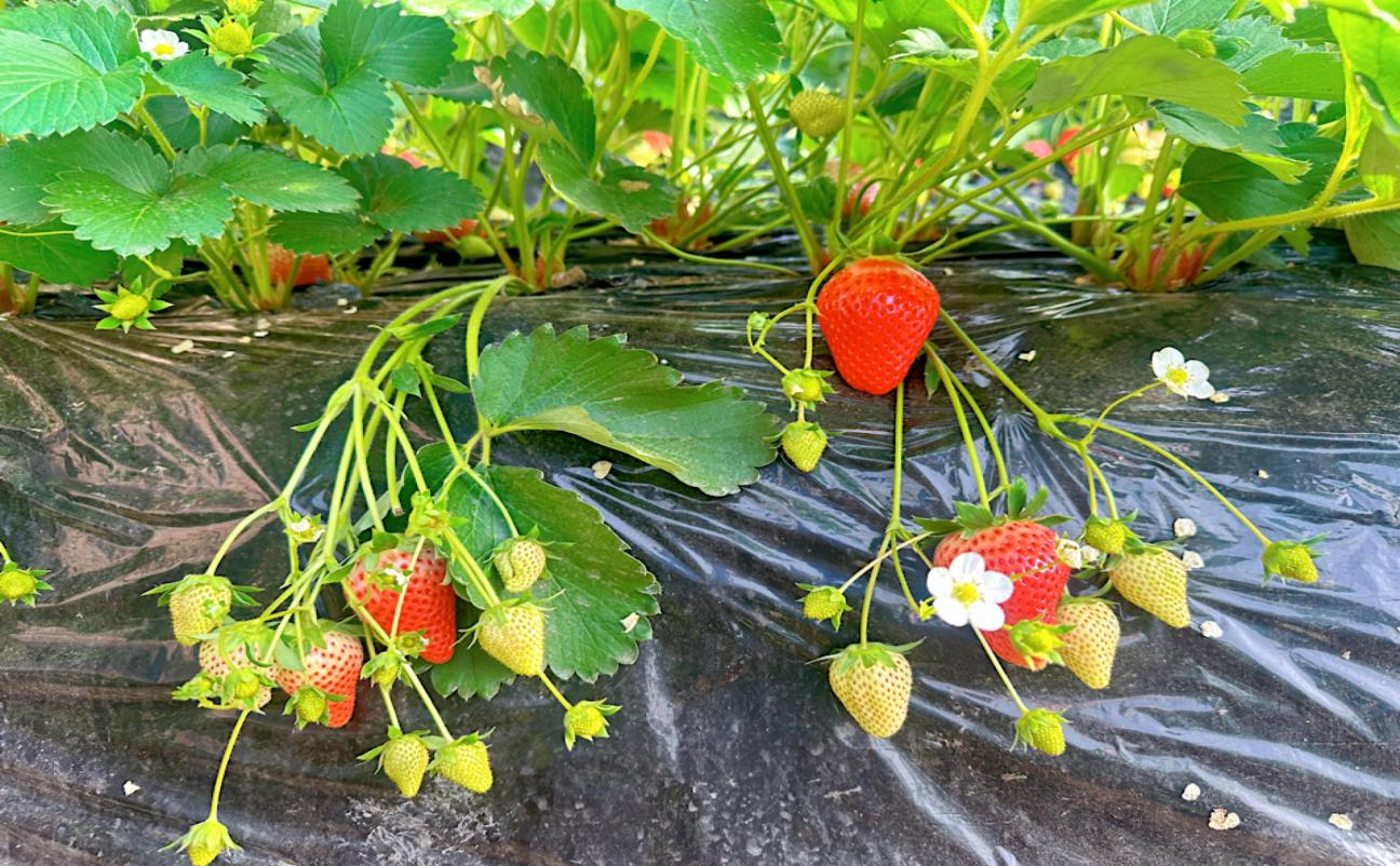大棚内,一畦畦草莓生机勃勃,绿意盎然,一颗颗红彤彤的草莓点缀其间,茂密的草莓枝叶映入眼帘,绿油油的枝叶下簇拥着颗颗鲜红的草莓。鲜嫩欲滴,异常诱人。摘下一颗放入口中“莓”香四溢,果实在唇齿间爆浆,回味无穷。