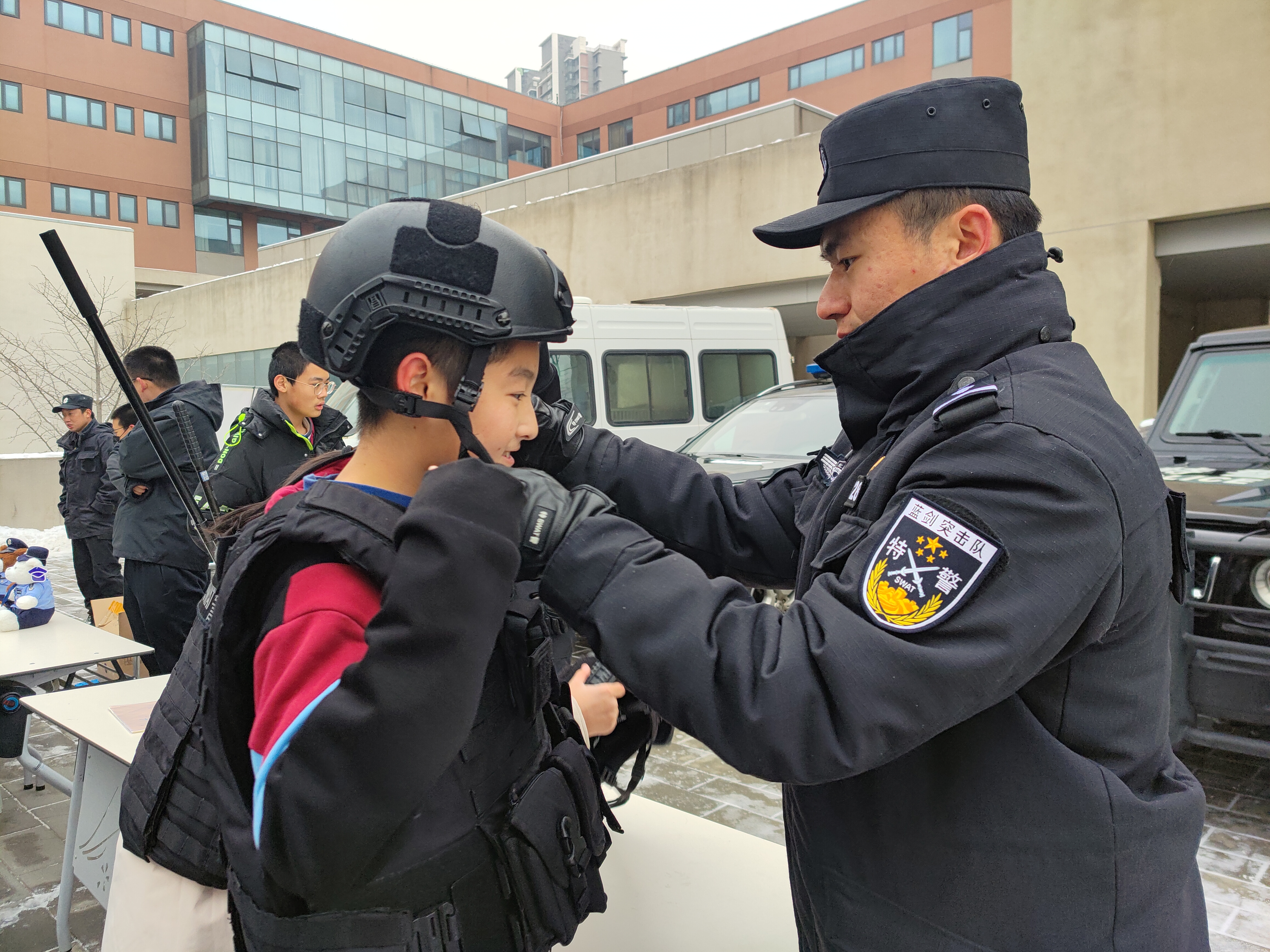 北京警方“平安有我”安全防范宣讲进校,中学生体验试穿警用装备