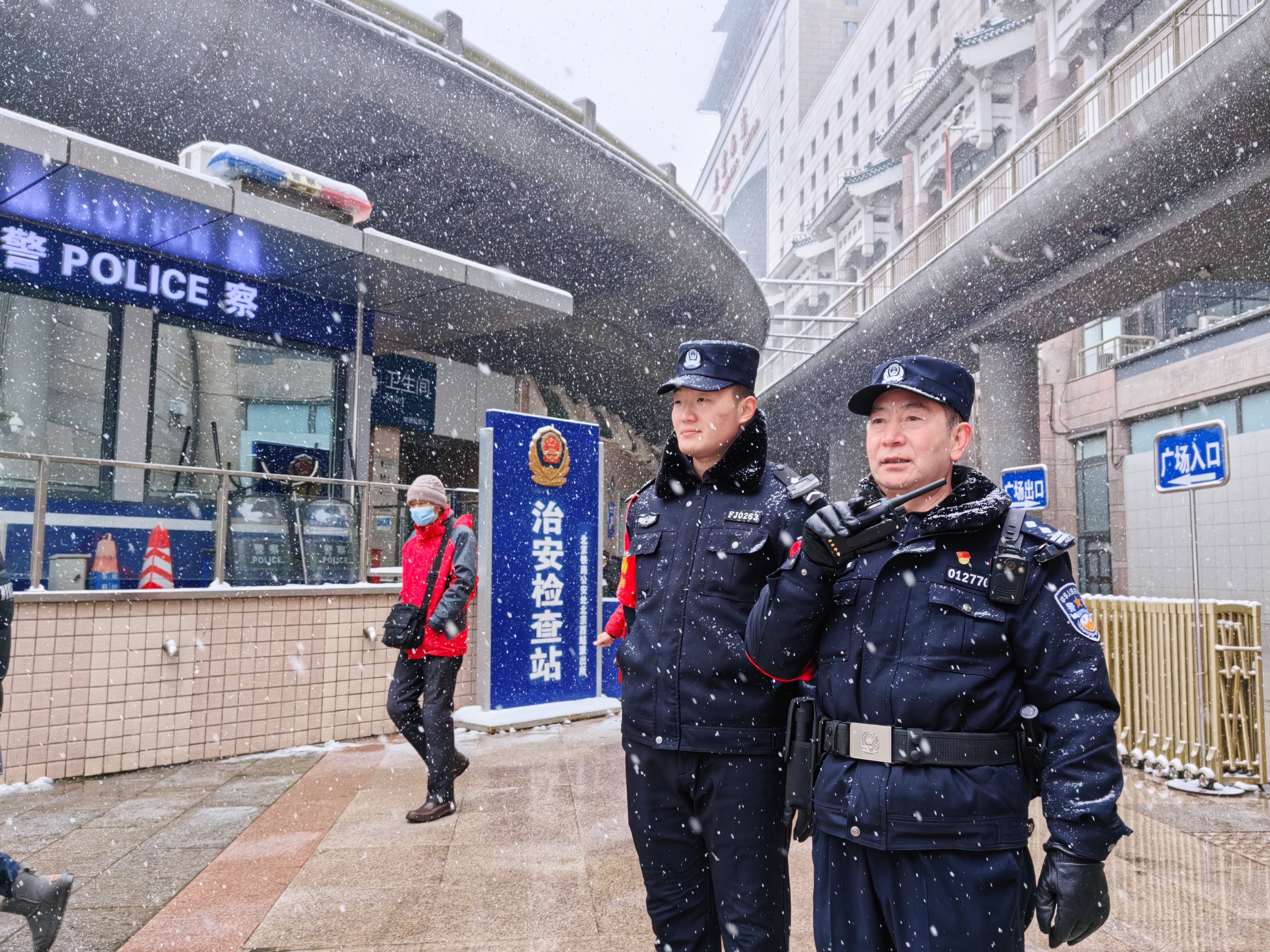民警在北京西站站前广场执勤。 图源:北京铁警