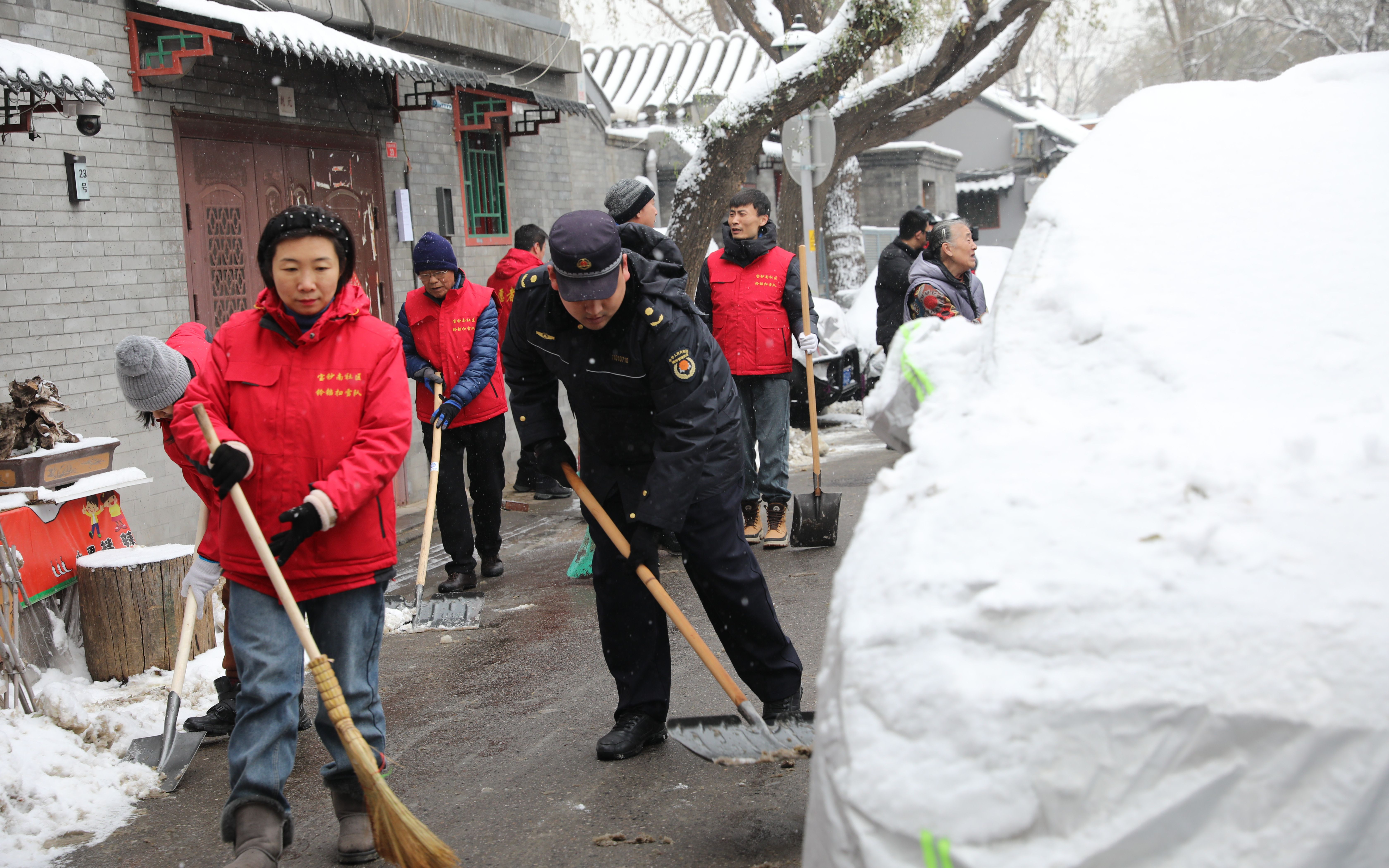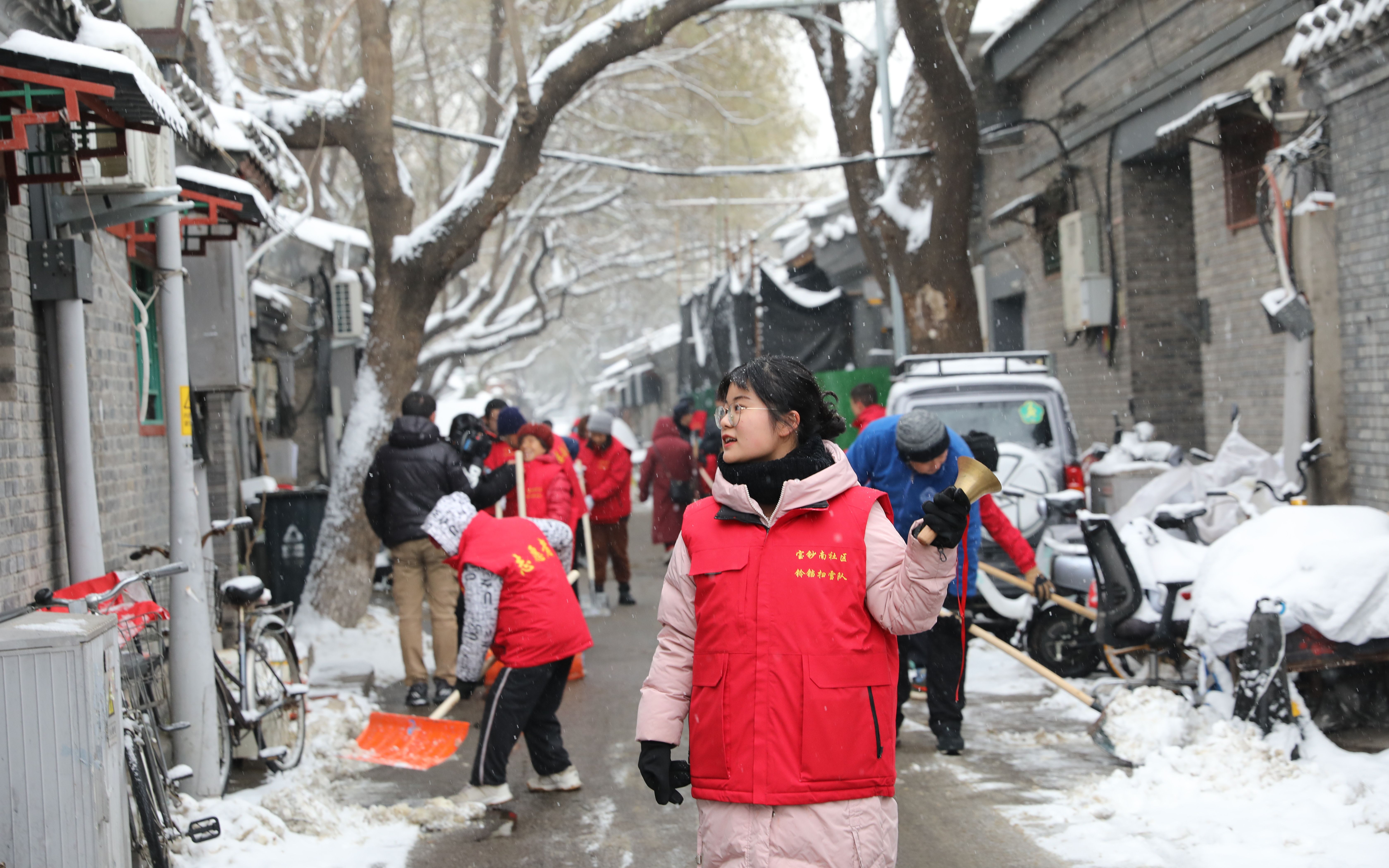 对于市民来说,大雪的降临让京城银装素裹,能饱览雪后美景,但也有对雪天路滑出行受阻的担忧,尤其是在一些背街小巷胡同里通行。“根据雪情预警信息,我们早早做好了准备,只要我手里这铃铛一响,胡同里大伙儿听见声音就知道出门扫雪了,群众的力量是巨大的,一会儿我们这几条胡同就能通畅起来,”安定门街道宝南社区书记助理白璐介绍。