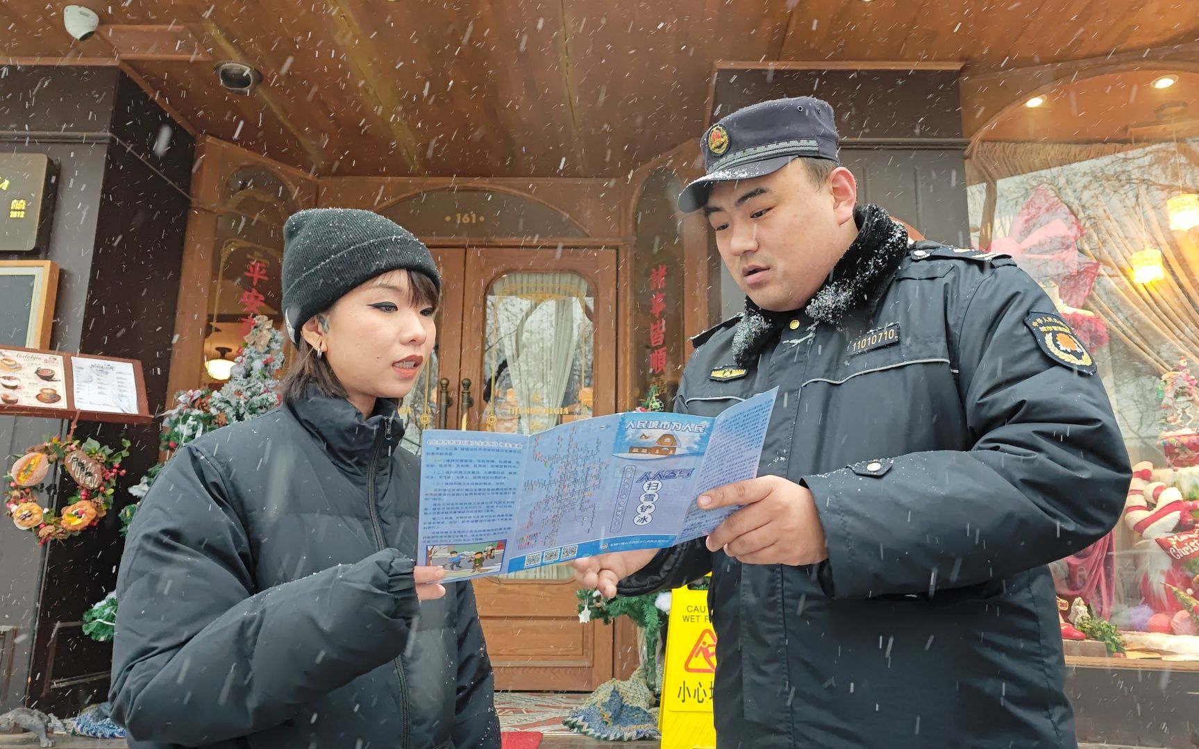 执法队员们来到已开门营业的商户,向负责人发放扫雪铲冰宣传手册,要求负责人按照要求随时关注“门前三包”区域人行通道上的积雪情况,准备好清扫工具和防滑提示牌,组织人员随下随扫,在营业期间要切实履行责任,不得让主要人行通道积雪结冰,存在安全隐患。