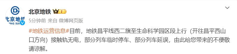 北京地铁昌平线这一区段故障 部分列车临时停车、部分列车延误