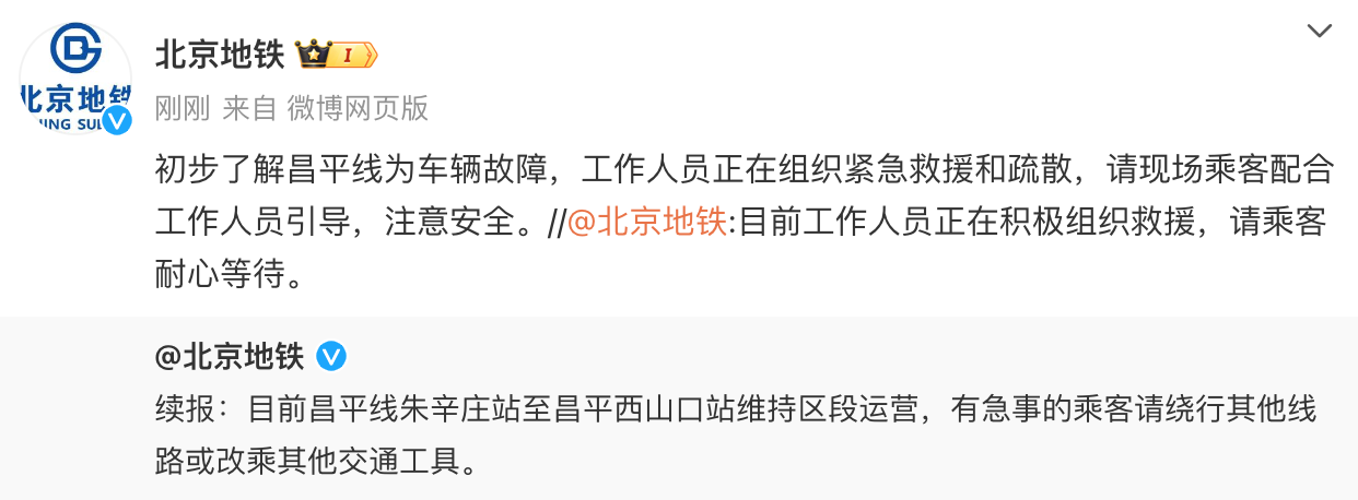 北京地铁:初步了解昌平线为车辆故障,工作人员正在组织紧急救援
