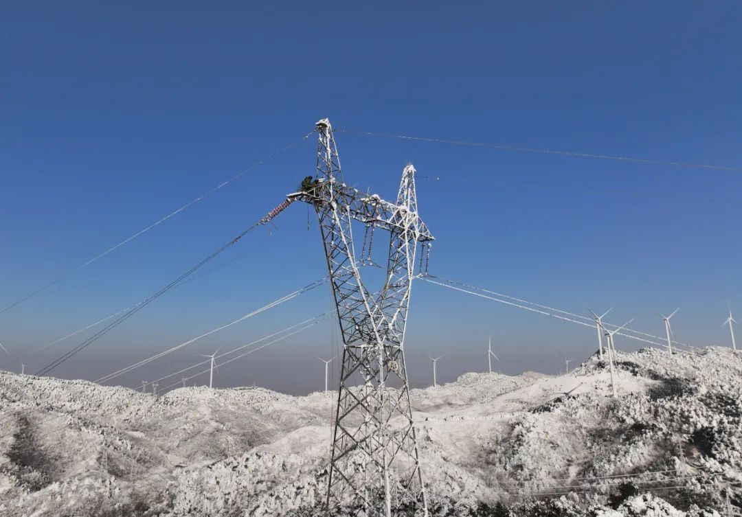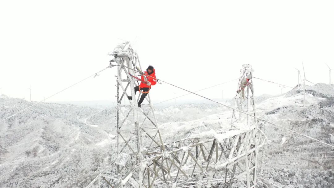 ▲电力抢修人员在塔顶清除架空地线覆冰