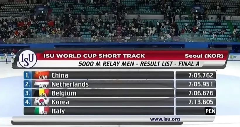 中国队夺得短道速滑世界杯首尔站男子5000米接力金牌
