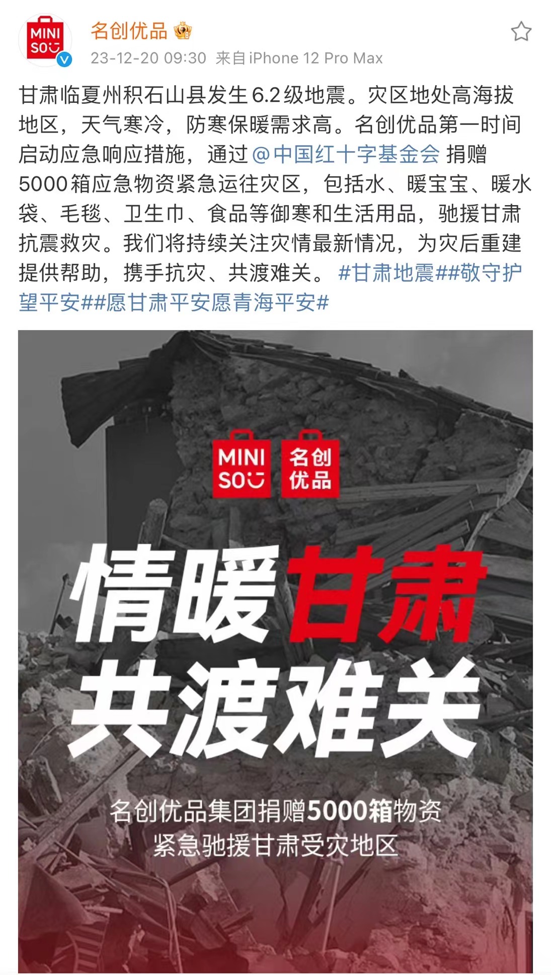 新京报讯(记者张洁)12月20日,名创优品在微博发布消息称,甘肃临夏州积石山县发生6.2级地震,灾区地处高海拔地区,天气寒冷,防寒保暖需求高。名创优品第一时间启动应急响应措施,通过中国红十字基金会捐赠5000箱应急物资紧急运往灾区,包括水、暖宝宝、暖水袋、毛毯、卫生巾、食品等御寒和生活用品,驰援甘肃抗震救灾。