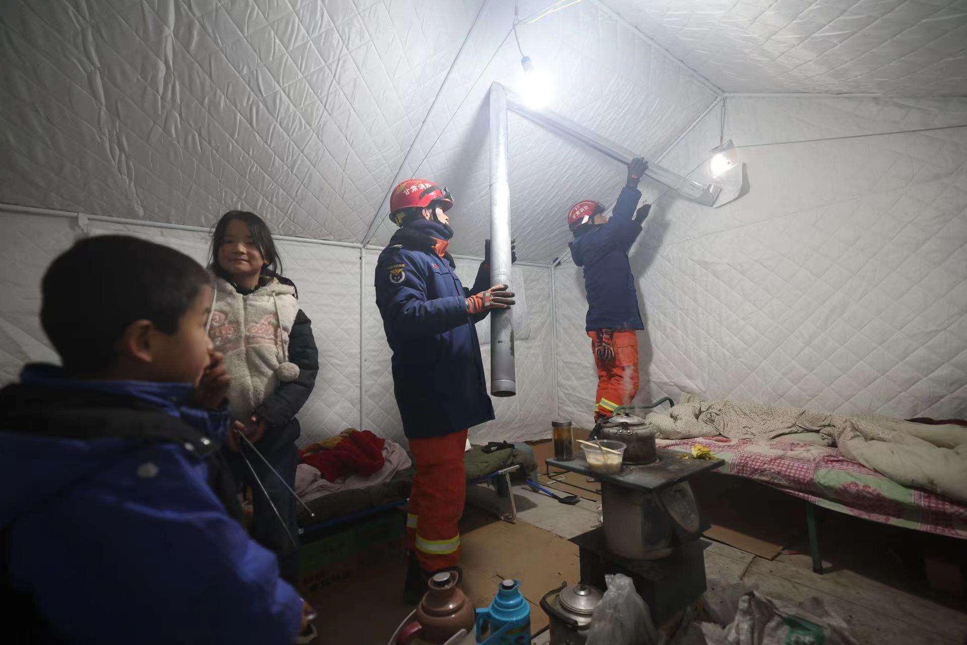 大河家镇安置点,消防员正在给刚搭建的帐篷安装煤炉。