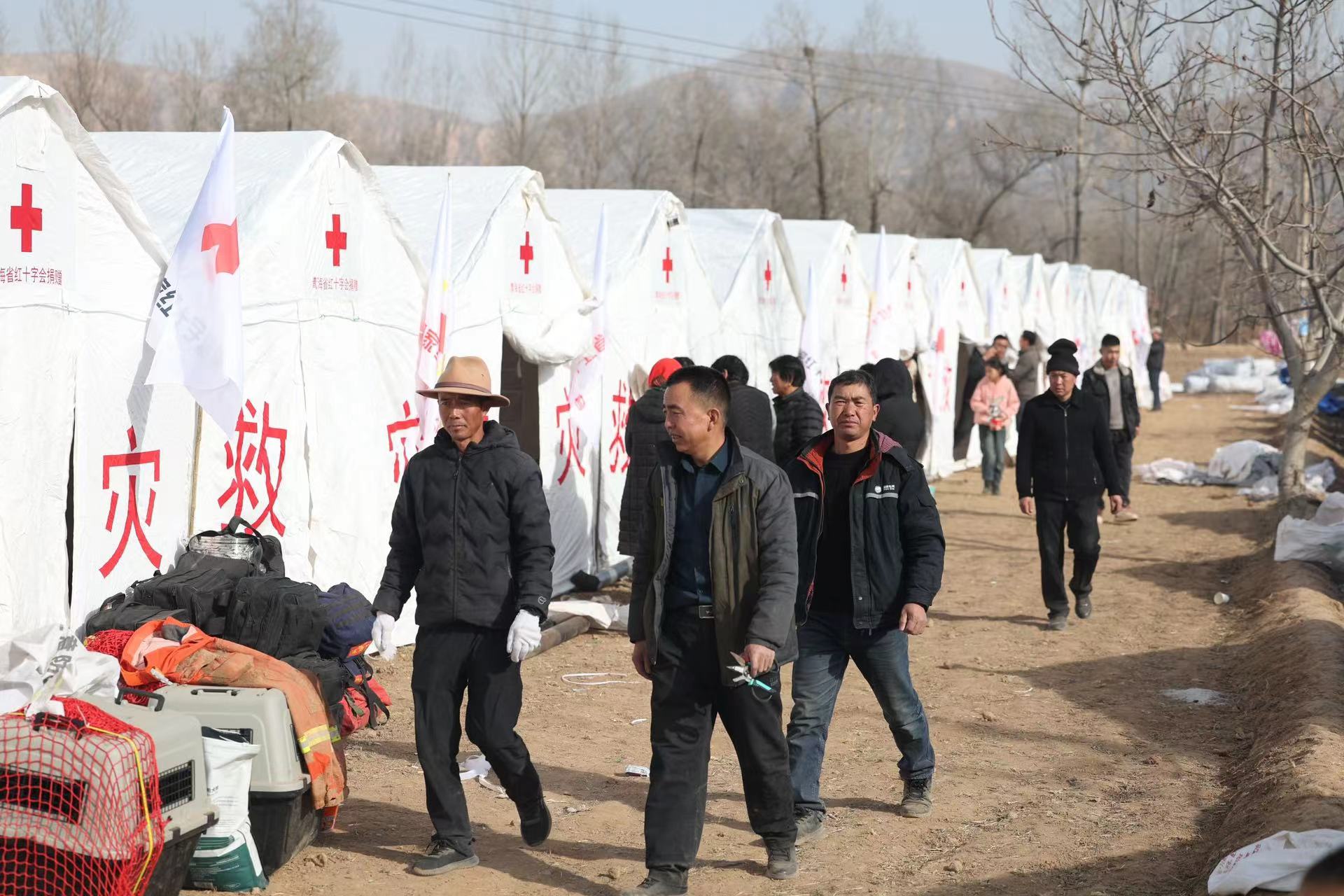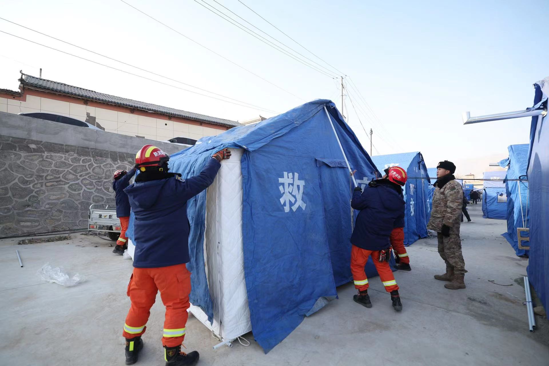 大河家镇安置点,消防员正在搭建救灾帐篷。