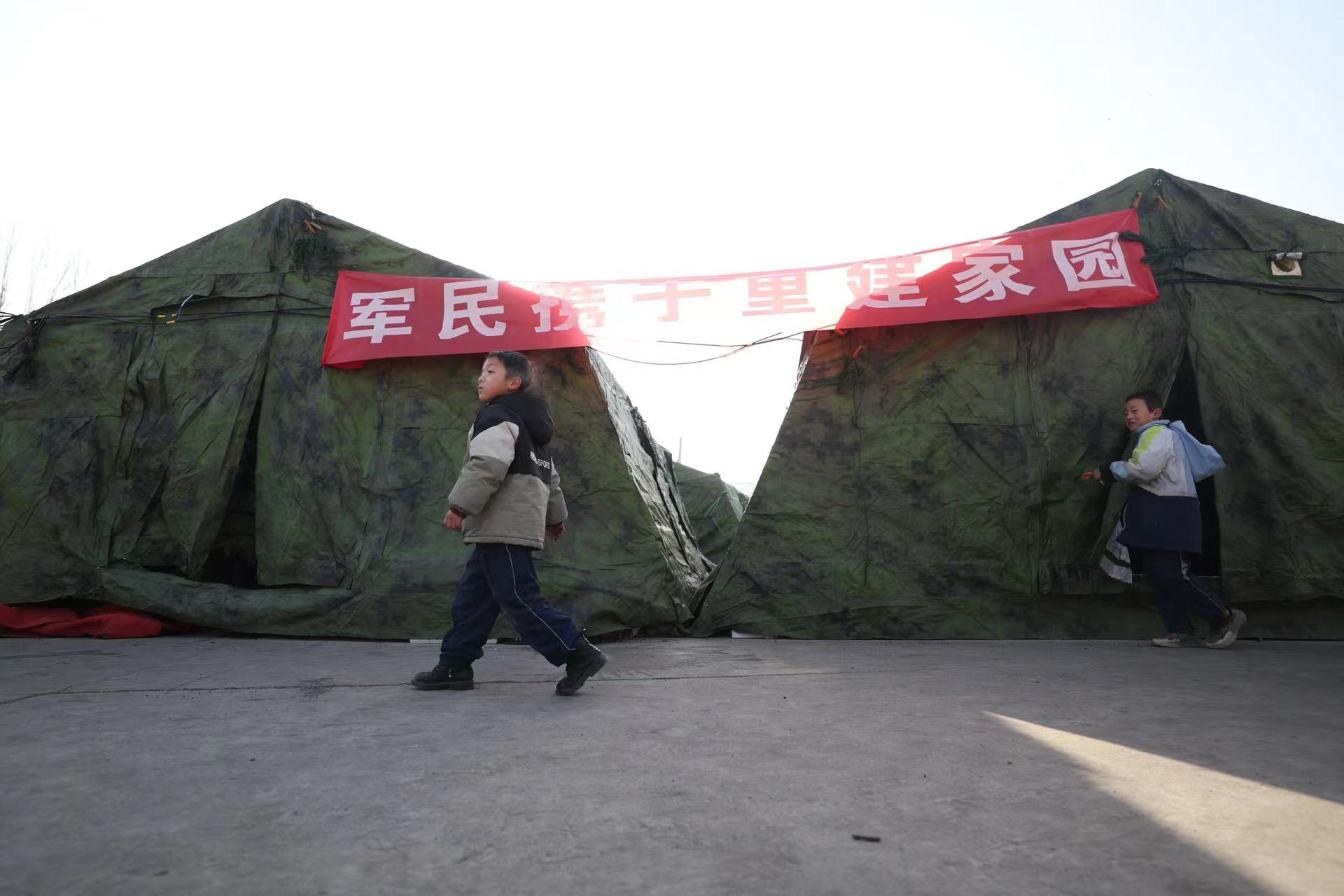 大河家镇安置点,小朋友走过“军民携手 重建家园”的横幅。