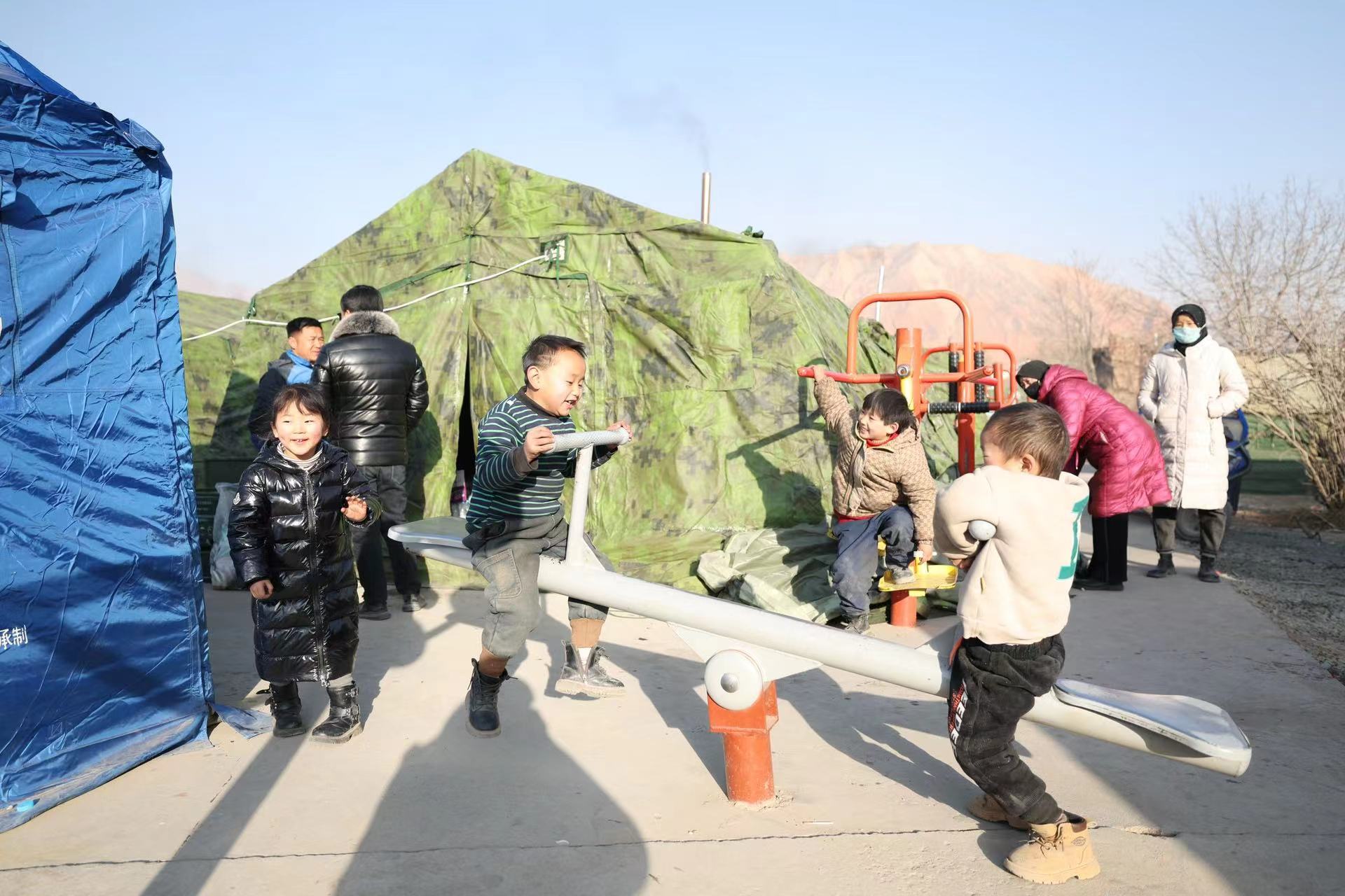 大河家镇临时安置点建在一处居民活动广场上,旁边有不少健身娱乐设备。一群少年儿童在此玩起了跷跷板,孩子们的欢声笑语在安置点传开。