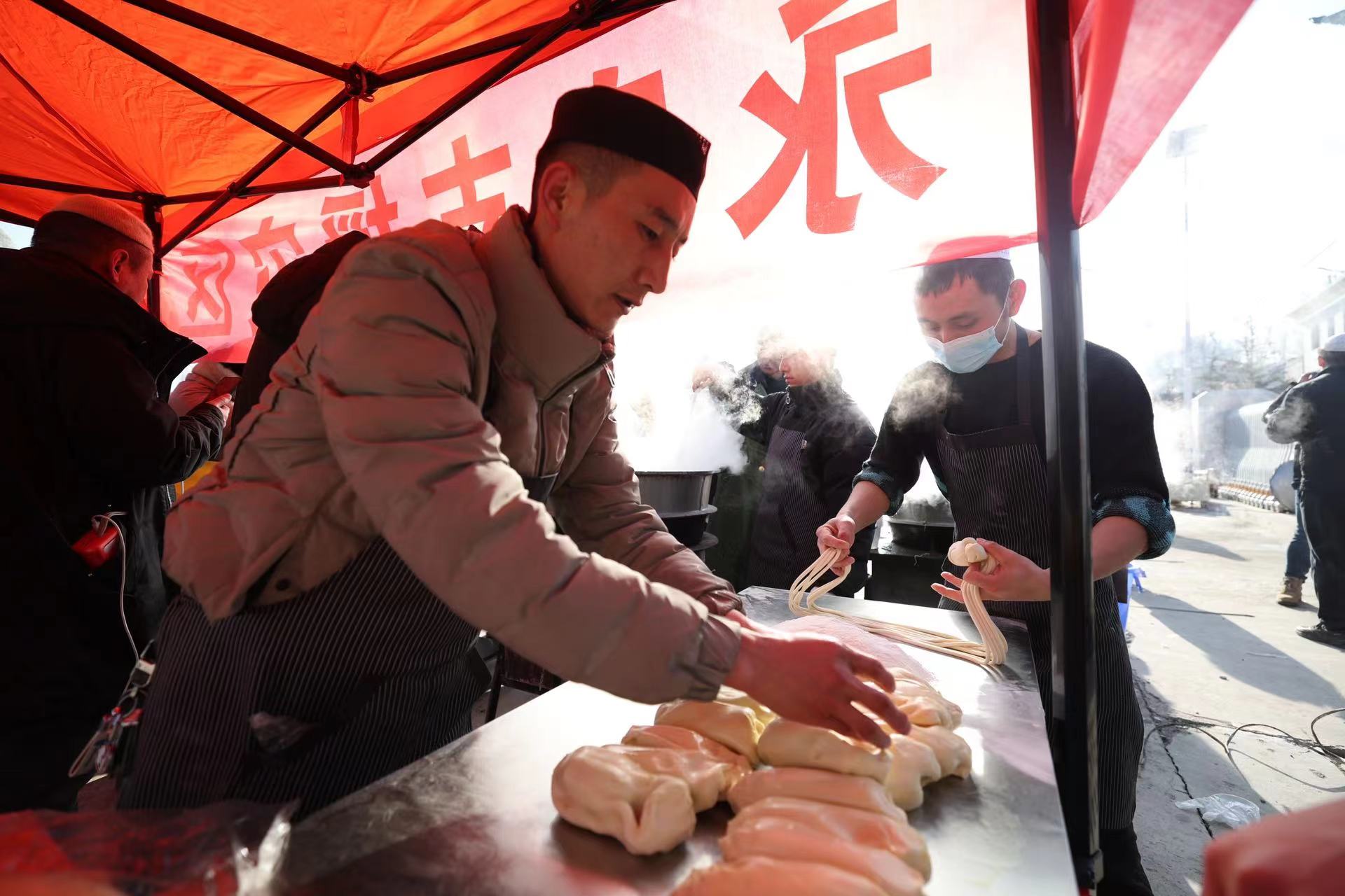大河家镇安置点拉面师傅正在为受灾群众赶制拉面。