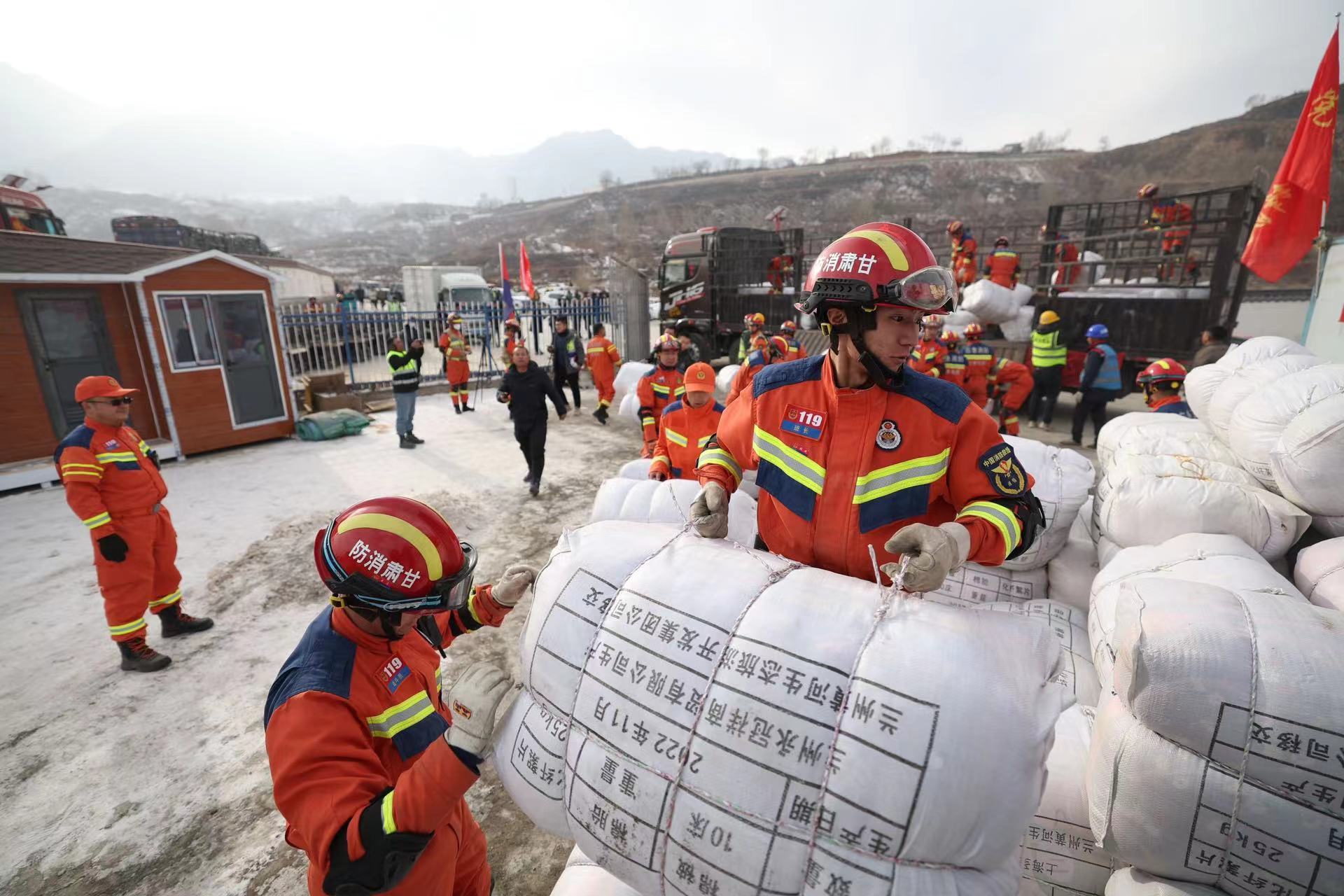 大河家镇梅坡村委会安置点,甘肃消防正在搬运抵达的过冬物资。