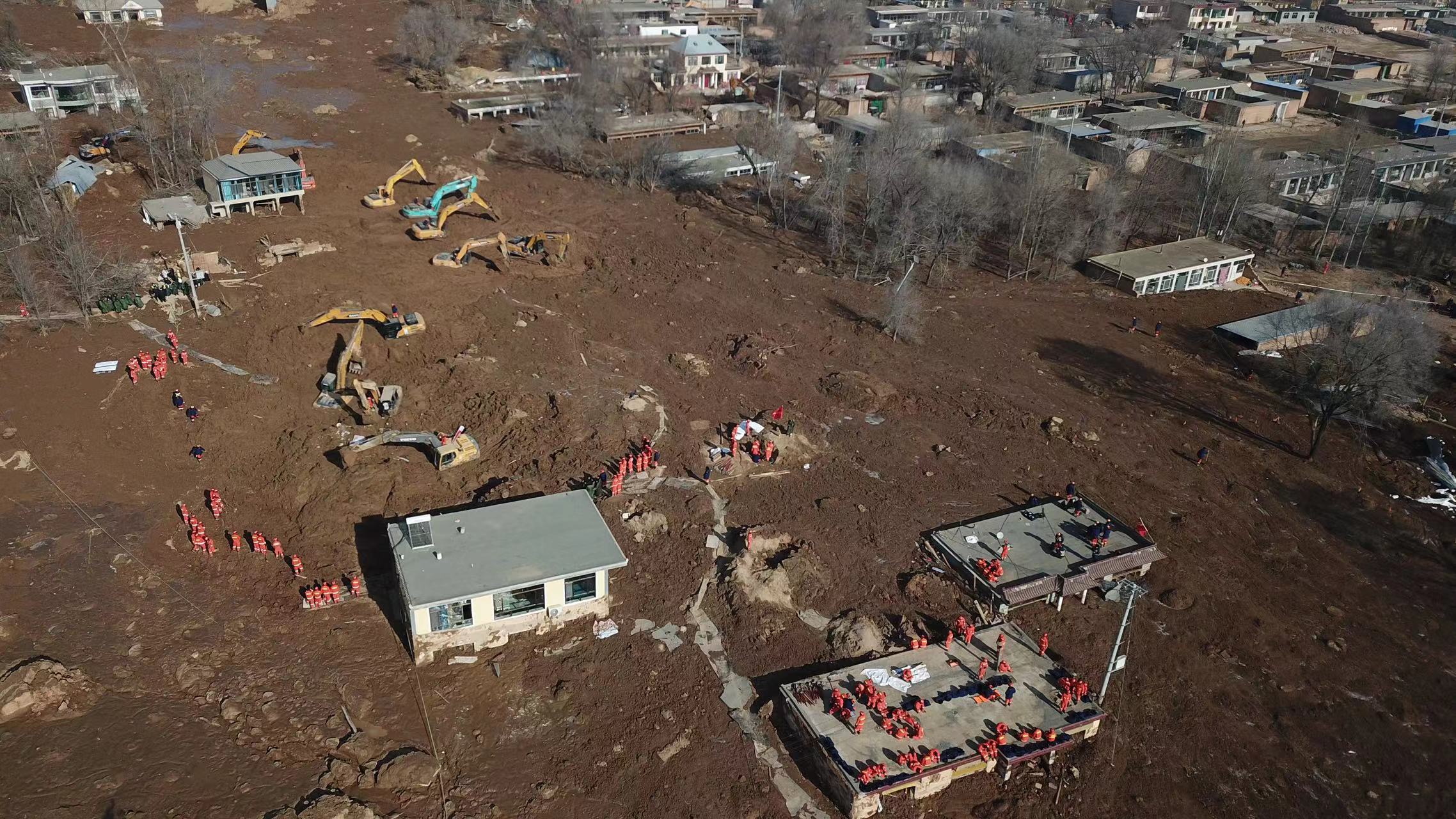 地震引发青海海东民和县中川乡发生局地砂涌,中川乡草滩村救援人员正在进行搜救(航拍)。