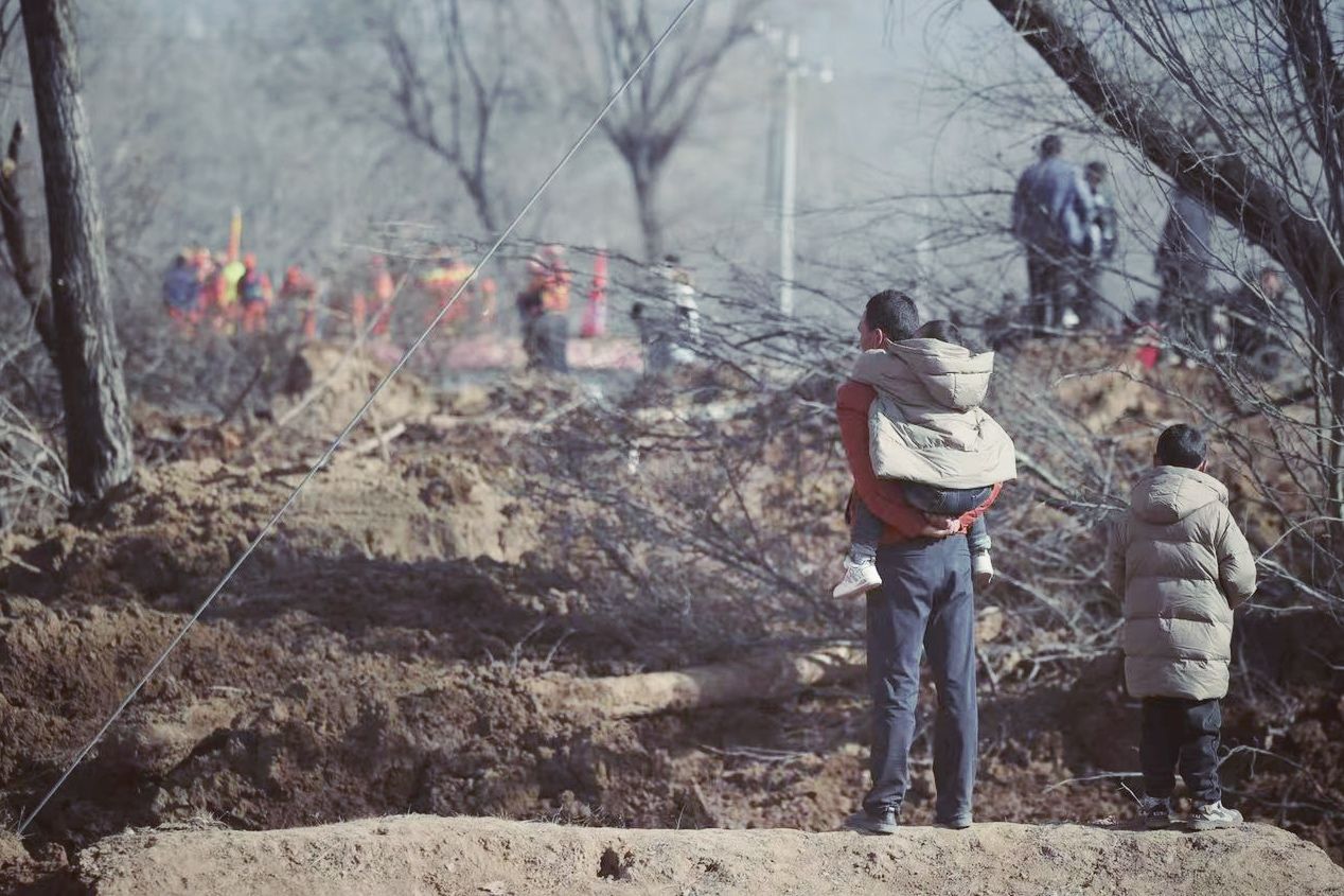青海省草滩村村民看着远处的救援人员进行搜救工作。