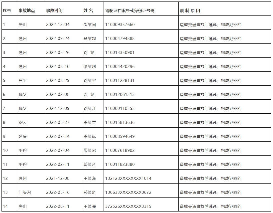 新京报讯 据北京市公安交管局消息,近期,市公安交管部门对在本市发生交通事故后逃逸构成犯罪,被依法追究刑事责任的14名人员,依法作出吊销机动车驾驶证,且终生不得重新取得机动车驾驶证的处罚。