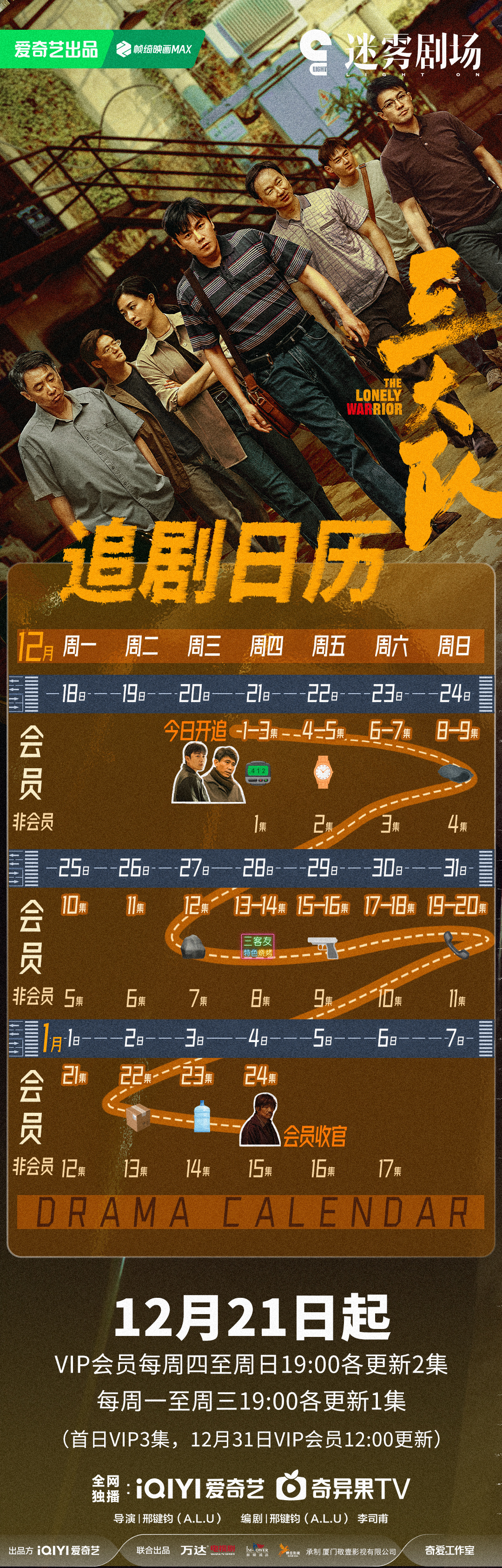 新京报讯 12月21日,由秦昊、李乃文、陈明昊等领衔主演的网剧《三大队》在爱奇艺迷雾剧场开播,追剧日历发布。该剧将连更15天。