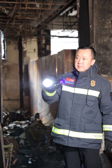 谭远林在火灾事故调查现场。受访者供图