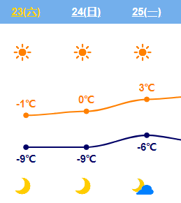 据气象部门预报:周日白天晴间多云,北转南风2、3级,最高气温0℃;夜间晴,南转北风1、2级,最低气温-9℃。周一白天晴转多云,北转南风2、3级,最高气温3℃;夜间多云转晴,南转北风2、3级,最低气温-6℃。气温较本周前期有所回升,但出行仍需做好防寒保暖。